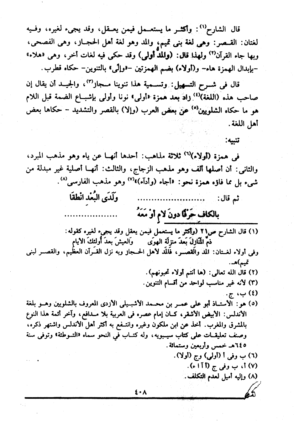 قال في شرح التسهيل: وتسمية هذا تنوينا مجاز3، والجيد أن يقال: إن صاحب هذه "اللغة"4 زاد بعد همزة "أولي" نونا وأولي بإشباع الضمة قبل اللام هو ما حكاه الشلوبين5 عن بعض العرب "وإلا" بالقصر والتشديد, حكاها بعض أهل اللغة.