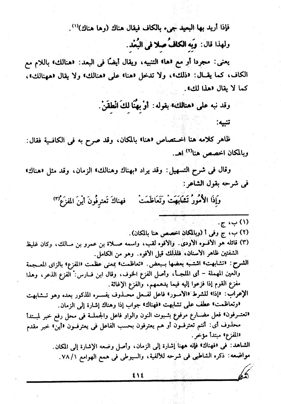 يعني: مجردا أو مع "ها" التنبيه، ويقال أيضا في البعد: "هنالك" باللام مع الكاف، كما يقال: "ذلك", ولا تدخل "هنا" على "هنالك" ولا يقال: "ههنالك"، كما لا يقال "هذا لك".