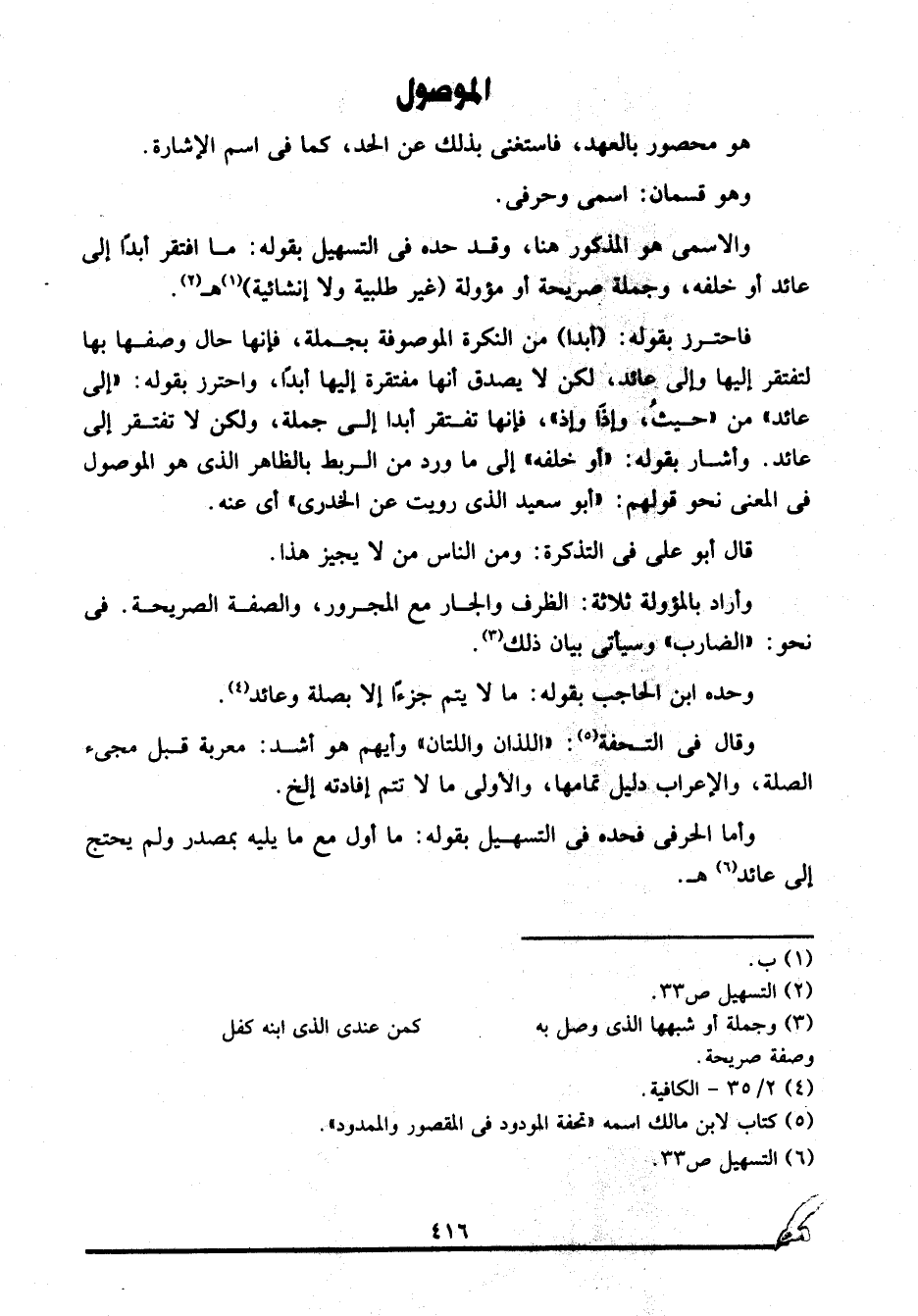 والاسمي هو المذكور هنا، وقد حده في التسهيل بقوله: ما افتقر أبدا إلى عائد أو خلفه، وجملة صريحة أو مؤولة "غير طلبية ولا إنشائية"1. ا. هـ2.