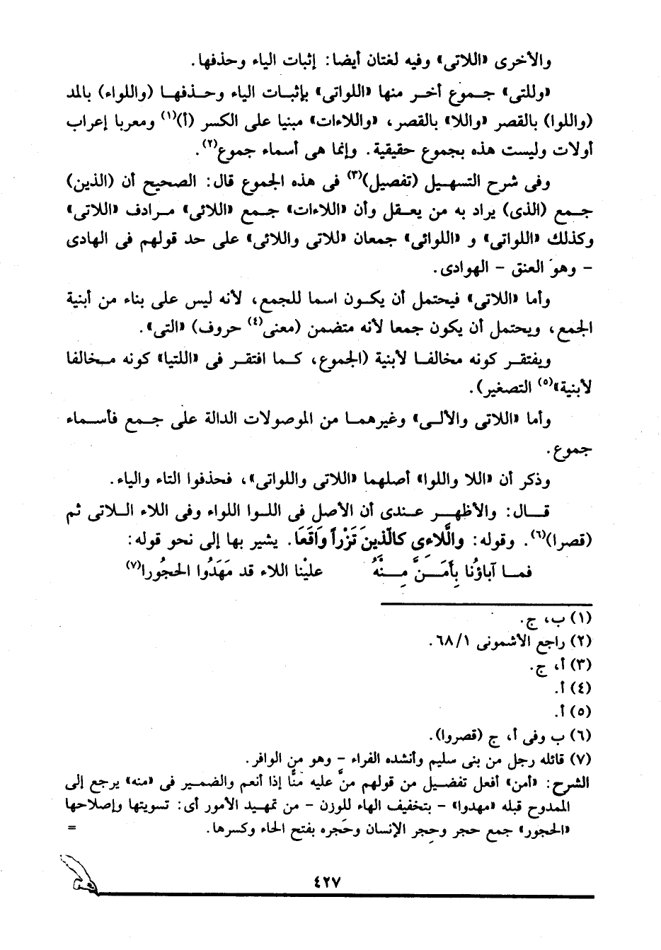 وفي شرح التسهيل "تفصيل"3 في هذه الجموع قال: الصحيح أن "الذين" جمع "الذي" يراد به من يعقل وأن "اللاءات" جمع "اللائي" مرادف "اللاتي" وكذلك "اللواتي" و"اللوائي" جمعان "للاتي واللائي" على حد قولهم في الهادي -وهو العنق- الهوادي.