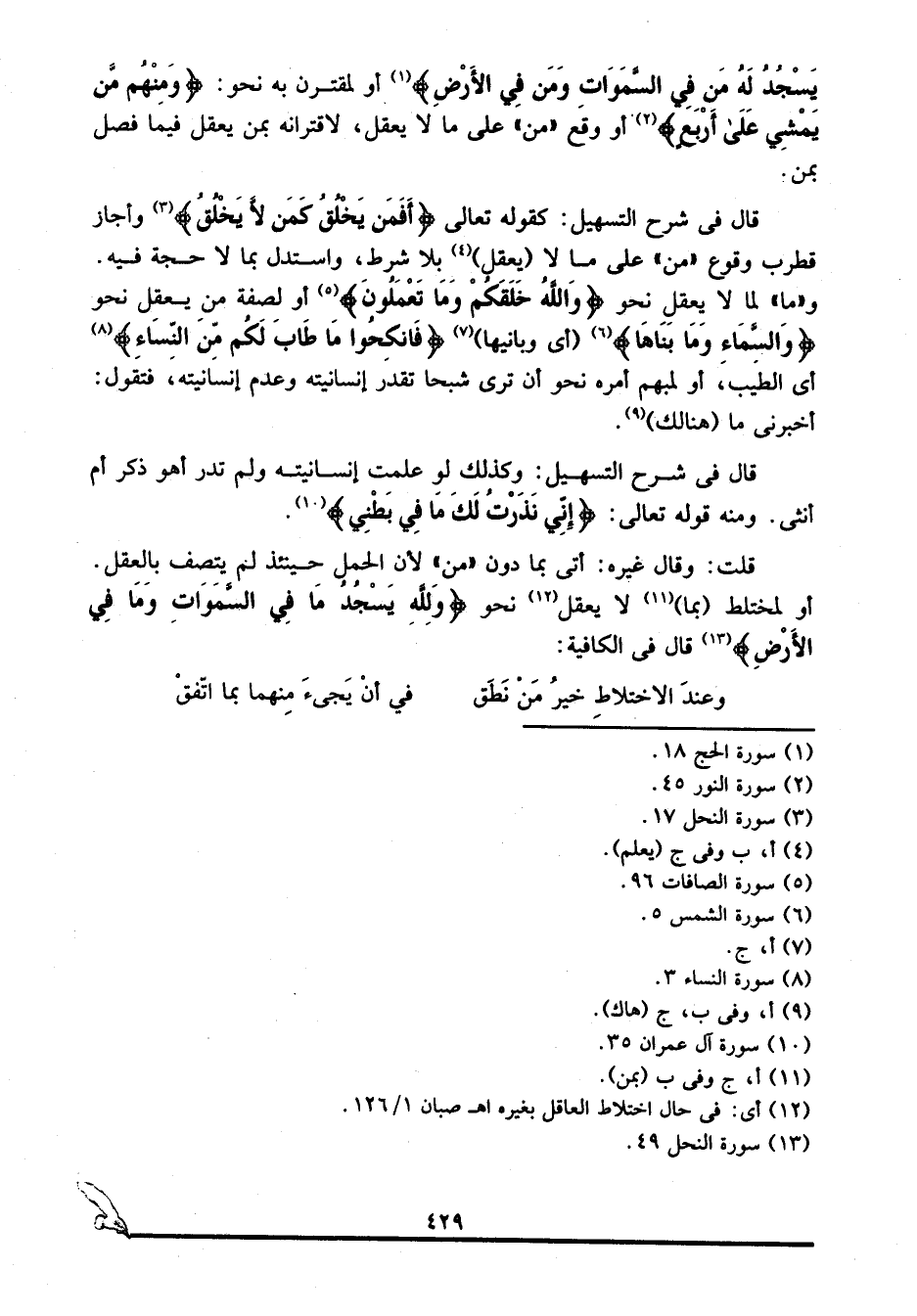 يَسْجُدُ لَهُ مَنْ فِي السَّمَاوَاتِ وَمَنْ فِي الْأَرْضِ} 1 أو لمقترن به نحو: {وَمِنْهُمْ مَنْ يَمْشِي عَلَى أَرْبَعٍ} 2 أو وقع "من" على ما لا يعقل، لاقترانه بمن يعقل فيما فصل بمن.