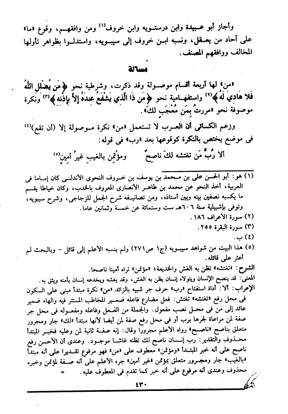 1 هو: أبو الحسن علي بن محمد بن يوسف بن خروف النحوي الأندلسي كان إماما في العربية، أخذ النحو عن محمد بن طاهر الأنصاري المعروف بالخدب، وكان خياطا يقسم ما يكسبه نصفين بينه وبين أستاذه، ومن تصانيفه شرح الجمل للزجاجي، وشرح سيبويه وتوفي بإشبيلية سنة 606هـ ست وستمائة عن خمسة وثمانين عاما.