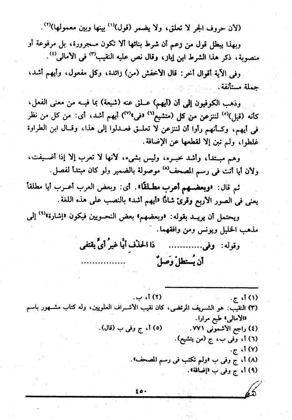 وذهب الكوفيون إلى أن "أيهم" علق عنه "شيعة" بما فيه من معنى الفعل، كأنه "قيل"5 لننزعن من كل "متشيع6 "في"7" أيهم أشد، أي: من كل من نظر في أيهم، وكأنهم رأوا أن لننزعن لا تعلق فعدلوا إلى هذا، وقال ابن الطراوة: غلطوا، ولم تبن إلا لقطعها عن الإضافة.