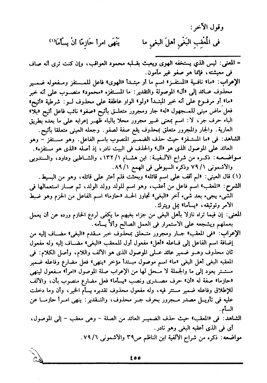 الإعراب: "في المعقب" جار ومجرور متعلق بمحذوف خبر مقدم, "البغي" مضاف إليه من إضافة اسم الفاعل إلى فاعله, "أهل" مفعول أول للمعقب, "البغي" مضاف إليه وله مفعول ثان محذوف وهو ضمير عائد على الموصول الذي هو الألف واللام، وأصل الكلام: في المعقبه البغي أهل البغي, "ما" اسم موصول مبتدأ مؤخر, "ينهى" فعل مضارع وفاعله ضمير مستتر يعود إلى ما والجملة لا محل لها من الإعراب صلة الموصول, "امرأ" مفعول لينهى, "حازما" صفة له, "أن" حرف مصدري ونصب, "يسأما" فعل مضارع منصوب بأن، والألف للإطلاق وفاعله ضمير مستتر فيه، وله مفعول محذوف تقديره يسأم الخير، وأن وما دخلت عليه في تأويل مصدر مجرور بحرف جر محذوف، والتقدير: ينهى امرأ حازما عن السأم.