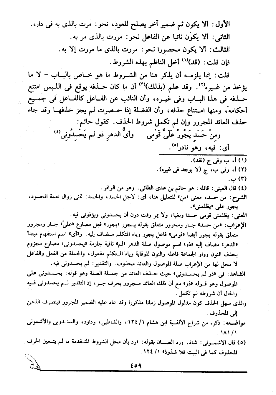 الشاهد: في "ذو لم يحسدوني" حيث حذف العائد من جملة الصلة وهو قوله: يحسدوني على الموصول وهو قوله: "ذو" مع أن ذلك العائد مجرور بحرف جر، إذ التقدير لم يحسدوني فيه والحال أن شروطه لم تكمل.