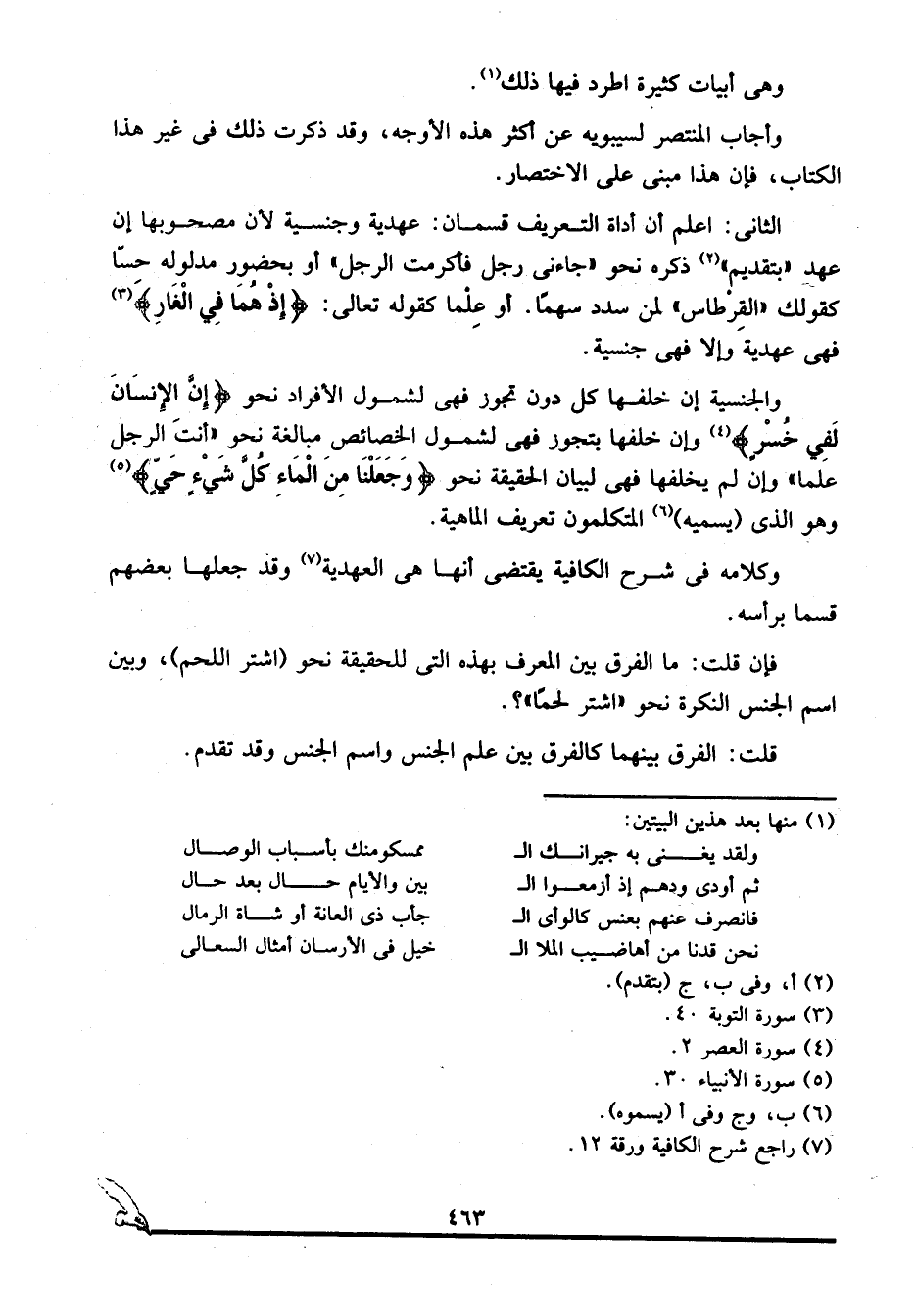 والجنسية إن خلفها كل دون تجوز فهي لشمول الأفراد نحو: {إِنَّ الإِنْسَانَ لَفِي خُسْرٍ} 4، وإن خلفها بتجوز فهي لشمول الخصائص مبالغة نحو: "أنت الرجل علما", وإن لم يخلفها فهي لبيان الحقيقة نحو: {وَجَعَلْنَا مِنَ الْمَاءِ كُلَّ شَيْءٍ حَيٍّ} 5 وهو الذي "يسميه"6 المتكلمون تعريف الماهية.