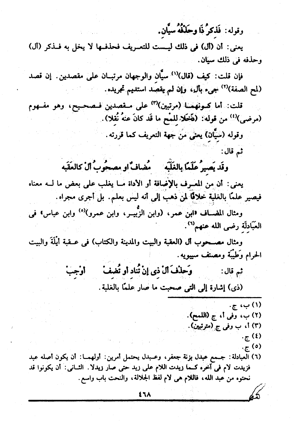 6 العبادلة: جمع عبدل بزنة جعفر، وعبدل يحتمل أمرين: أولهما: أن يكون أصله عبد فزيدت لام في آخره كما زيدت اللام على زيد حتى صار زيدلا. الثاني: أن يكونوا قد نحتوه من عبد الله، فاللام هي لام لفظ الجلالة، والنحت باب واسع.