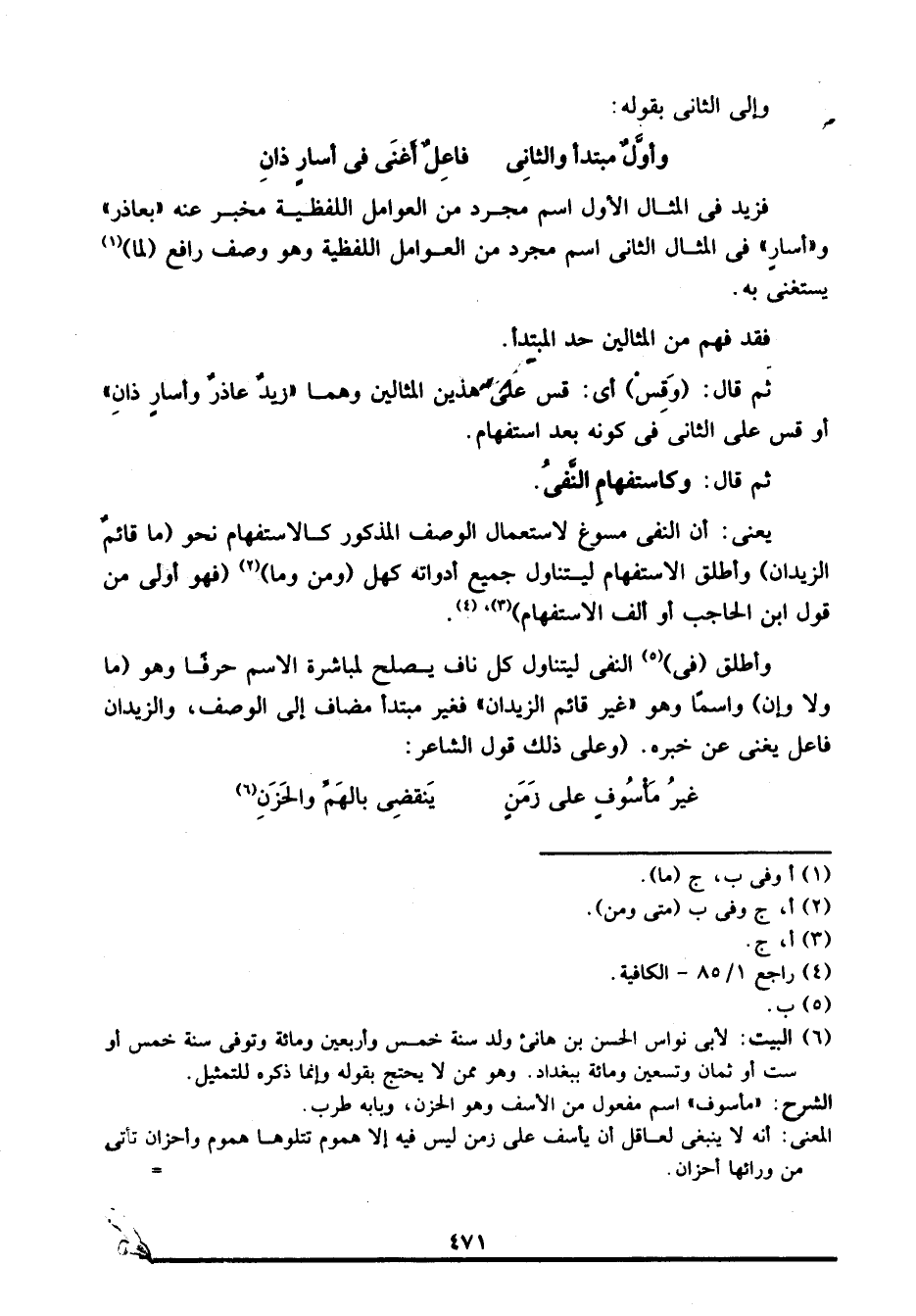 6 البيت: لأبي نواس الحسن بن هانئ ولد سنة خمس وأربعين ومائة وتوفي سنة خمس أو ست أو ثمان وتسعين ومائة ببغداد. وهو ممن لا يحتج بقوله وإنما ذكره للتمثيل.