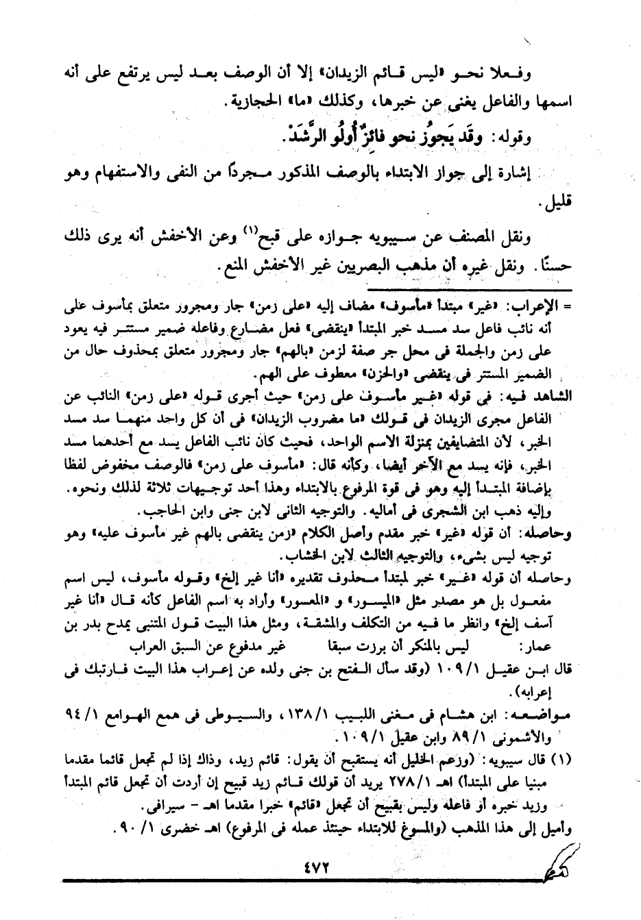 الشاهد فيه: في قوله "غير ماسوف على زمن" حيث أجرى قوله: "على زمن" النائب عن الفاعل مجرى الزيدان في قولك: "ما مضروب الزيدان" في أن كل واحد منهما سد مسد الخبر؛ لأن المتضايفين بمنزلة الاسم الواحد، فحيث كان نائب الفاعل يسد مع أحدهما مسد الخبر، فإنه يسد مع الآخر أيضا، وكأنه قال: "مأسوف على زمن" فالوصف مخفوض لفظا بإضافة المبتدأ إليه وهو في قوة المرفوع بالابتداء وهذا أحد توجيهات ثلاثة لذلك ونحوه, وإليه ذهب ابن الشجري في أماليه, والتوجيه الثاني لابن جني وابن الحاجب.