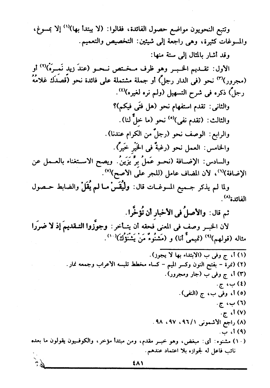 وتتبع النحويون مواضع حصول الفائدة، فقالوا: "لا يبتدأ بها"1 إلا بمسوغ، والمسوغات كثيرة، وهي راجعة إلى شيئين: التخصيص والتعميم.