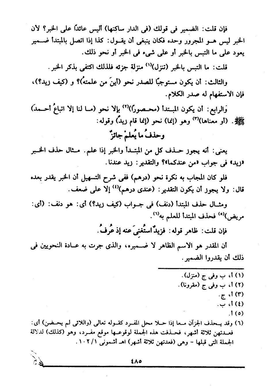 ومثال حذف المبتدأ "دنف" في جواب "كيف زيد؟ " أي: هو دنف, "أي: مريض"5 فحذف المبتدأ للعلم به6.