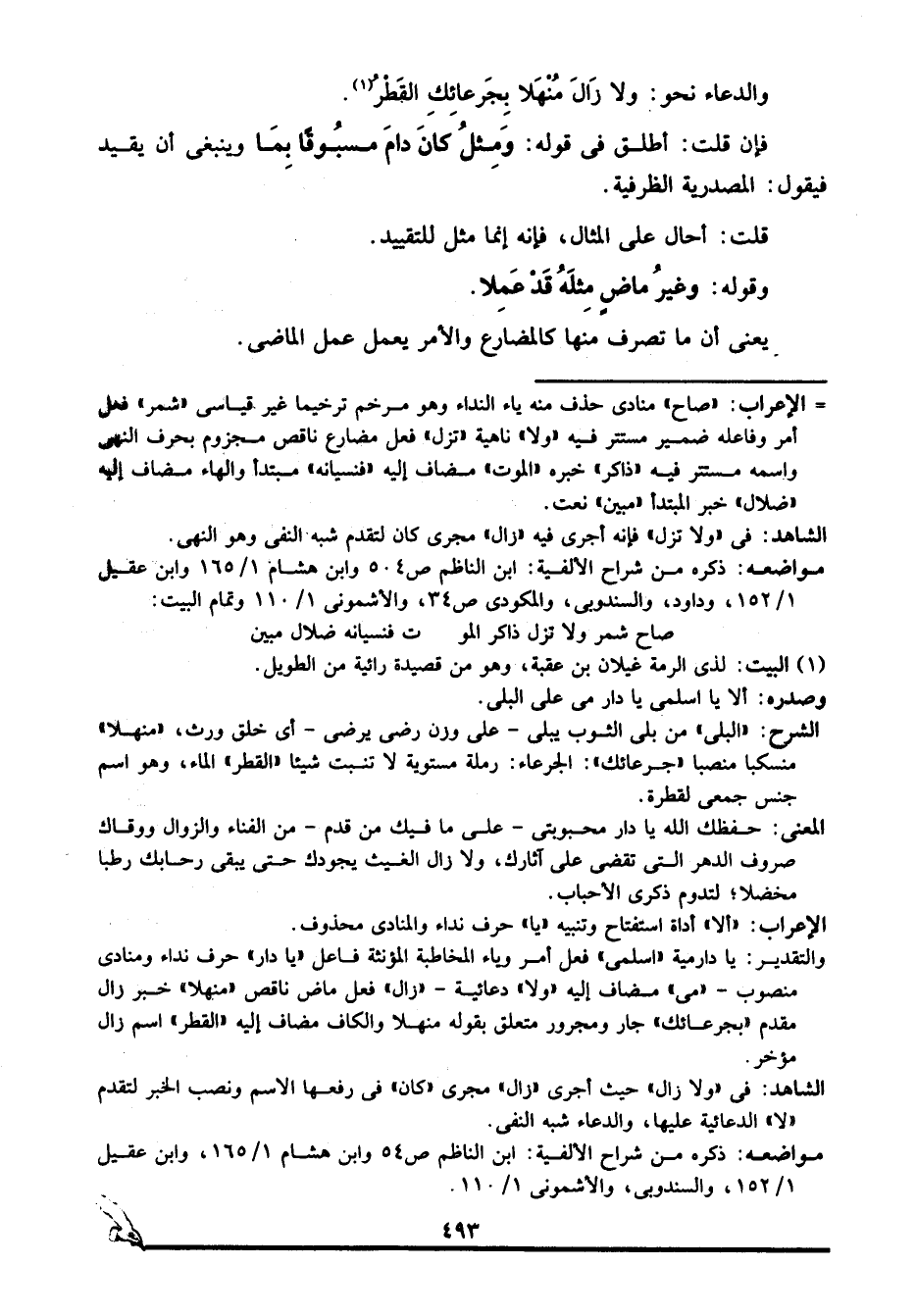 الشاهد: في "ولا زال" حيث أجرى "زال" مجرى "كان" في رفعها الاسم ونصب الخبر لتقدم "لا" الدعائية عليها، والدعاء شبه النفي.