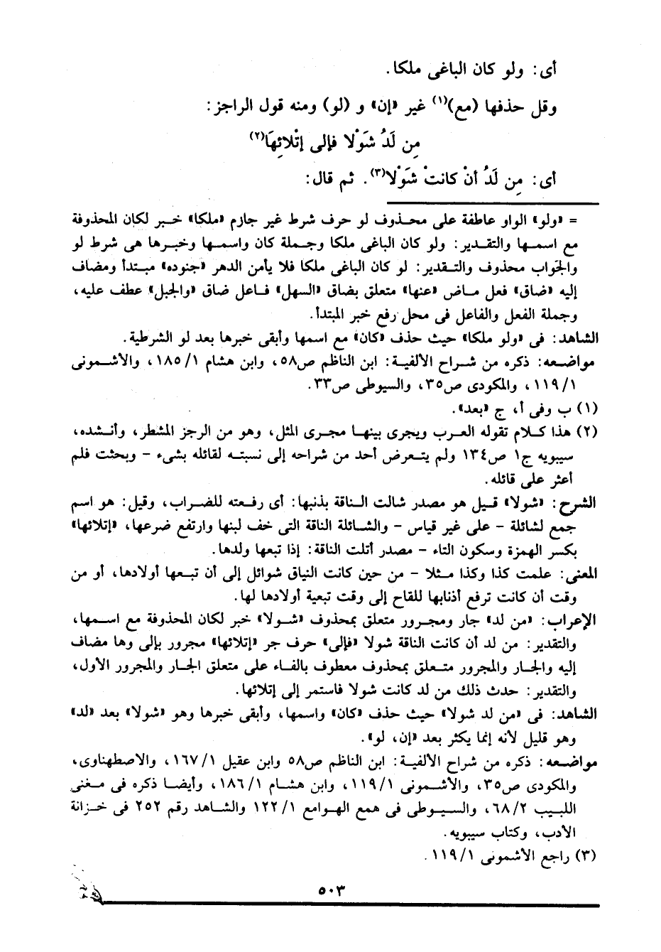 الشاهد: في "من لد شولا" حيث حذف "كان" واسمها، وأبقى خبرها وهو "شولا" بعد "لد" وهو قليل لأنه إنما يكثر بعد "إن، لو".