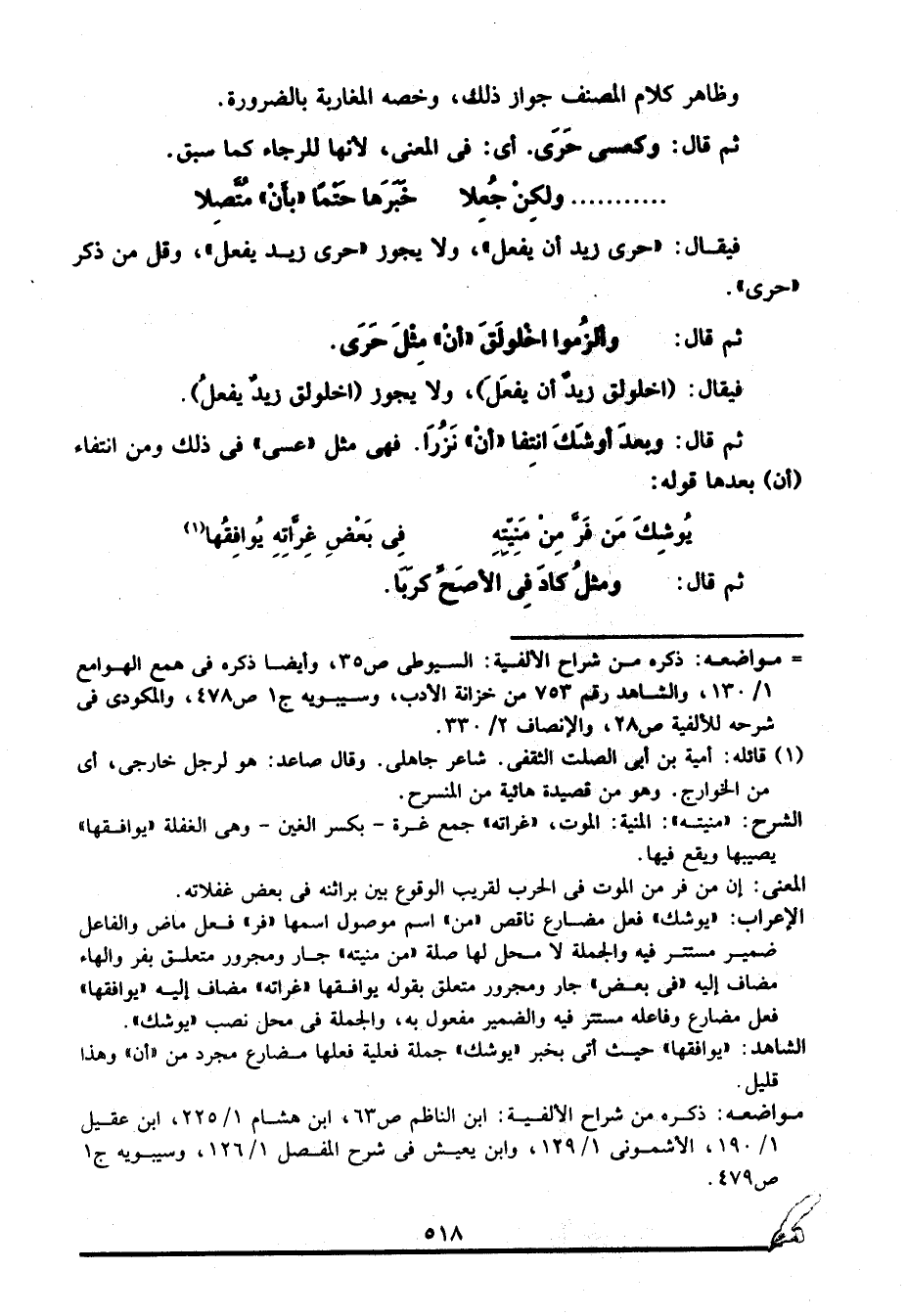 الإعراب "يوشك" فعل مضارع ناقص, "من" اسم موصول اسمها, "فر" فعل ماض والفاعل ضمير مستتر فيه والجملة لا محل لها صلة, "من منيته" جار ومجرور متعلق بفر والهاء مضاف إليه, "في بعض" جار ومجرور متعلق بقوله يوافقها, "غراته" مضاف إليه, "يوافقها" فعل مضارع وفاعله مستتر فيه والضمير مفعول به، والجملة في محل نصب "يوشك".