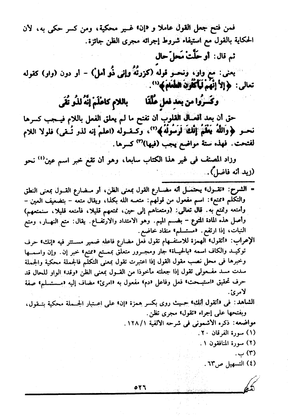 حق أن بعد أفعال القلوب أن تفتح ما لم يعلق الفعل باللام فيجب كسرها نحو: {وَاللَّهُ يَعْلَمُ إِنَّكَ لَرَسُولُهُ} 2، وكقوله "اعلم إنه لذو تقى" فلولا اللام لفتحت, فهذه ستة مواضع يجب "فيها"3 كسرها.