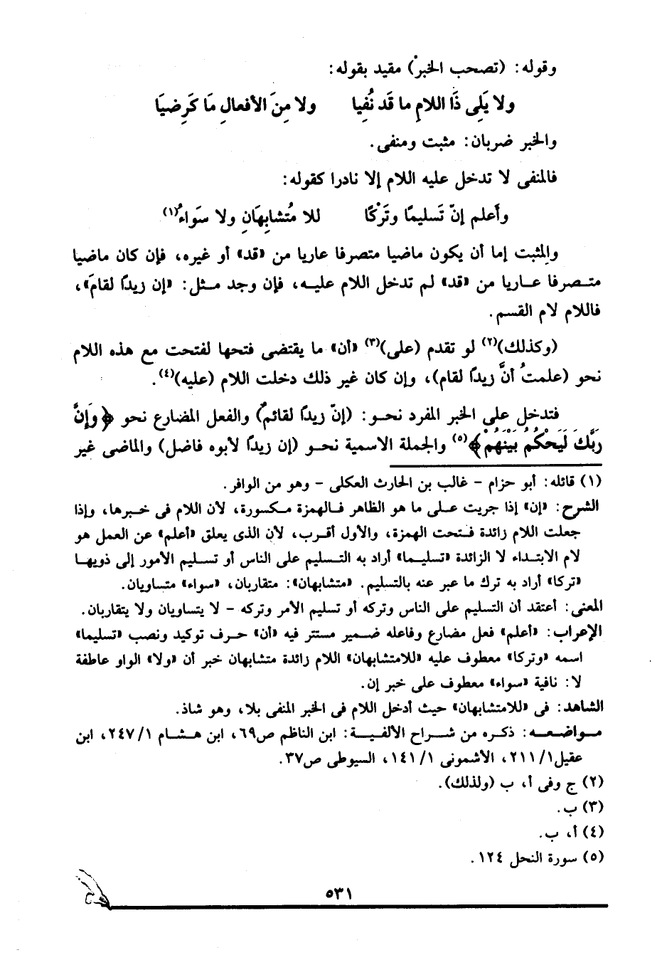 الشرح: "إن" إذا جريت على ما هو الظاهر فالهمزة مكسورة؛ لأن اللام في خبرها, وإذا جعلت اللام زائدة فتحت الهمزة، والأول أقرب؛ لأن الذي علق "أعلم" عن العمل هو لام الابتداء لا الزائدة "تسليما" أراد به التسليم على الناس أو تسليم الأمور إلى ذويها "تركا" أراد به ترك ما عبر عنه بالتسليم. "متشابهان": متقاربان، "سواء" متساويان.