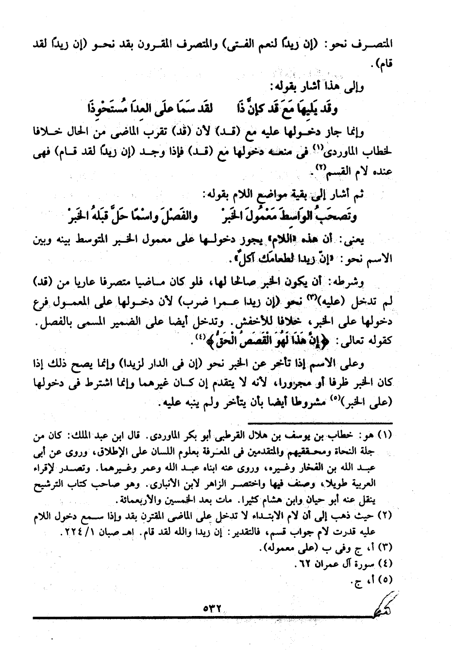 2 حيث ذهب إلى أن لام الابتداء لا تدخل على الماضي المقترن بقد وإذا سمع دخول اللام عليه قدرت لام جواب قسم، فالتقدير: إن زيدا والله لقد قام. ا. هـ. صبان 1/ 224.
