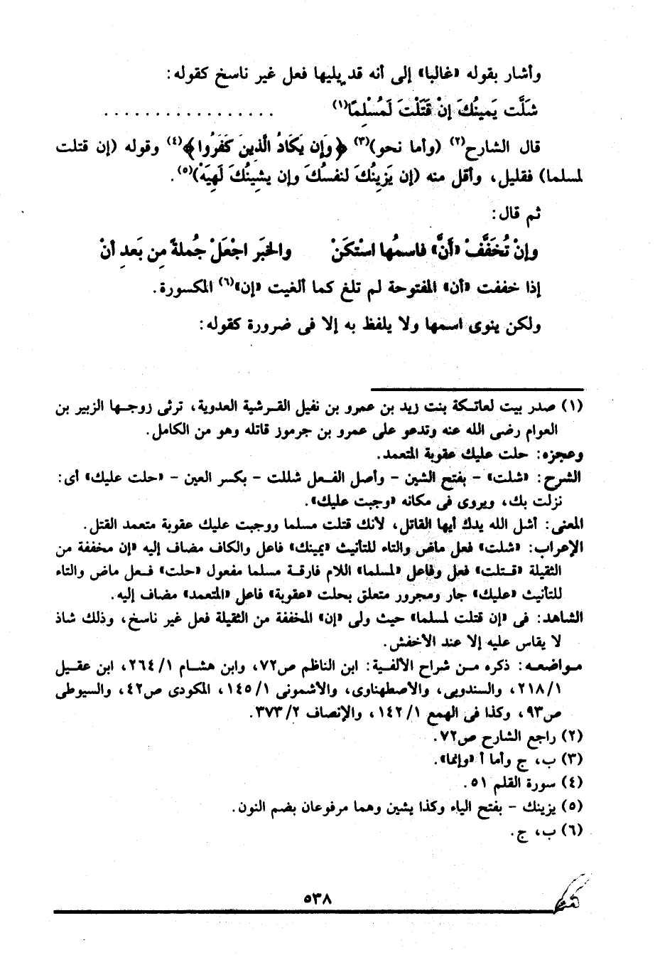 الشاهد: في "إن قتلت لمسلما" حيث ولي "إن" المخففة من الثقيلة فعل غير ناسخ، وذلك شاذ لا يقاس عليه إلا عند الأخفش.