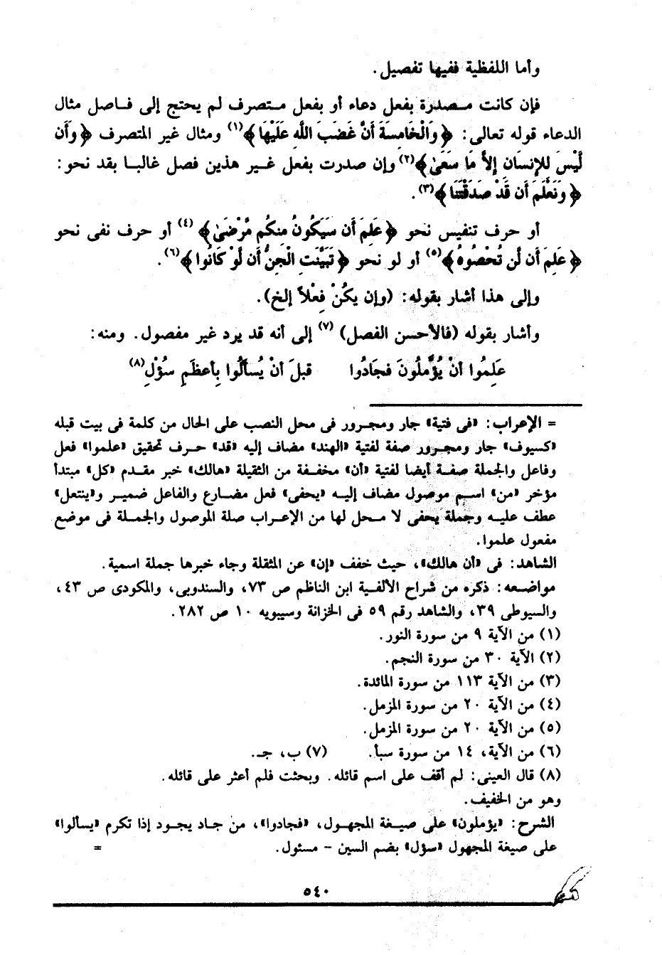 فإن كانت مصدرة بفعل دعاء أو بفعل متصرف لم يحتج إلى فاصل مثال الدعاء قوله تعالى: {وَالْخَامِسَةَ أَنَّ غَضَبَ اللَّهِ عَلَيْهَا} 1 ومثال غير المتصرف: {وَأَنْ لَيْسَ لِلْإِنْسَانِ إِلَّا مَا سَعَى} 2 وإن صدرت بفعل غير هذين غالبا بقد نحو: {وَنَعْلَمَ أَنْ قَدْ صَدَقْتَنَا} 3.