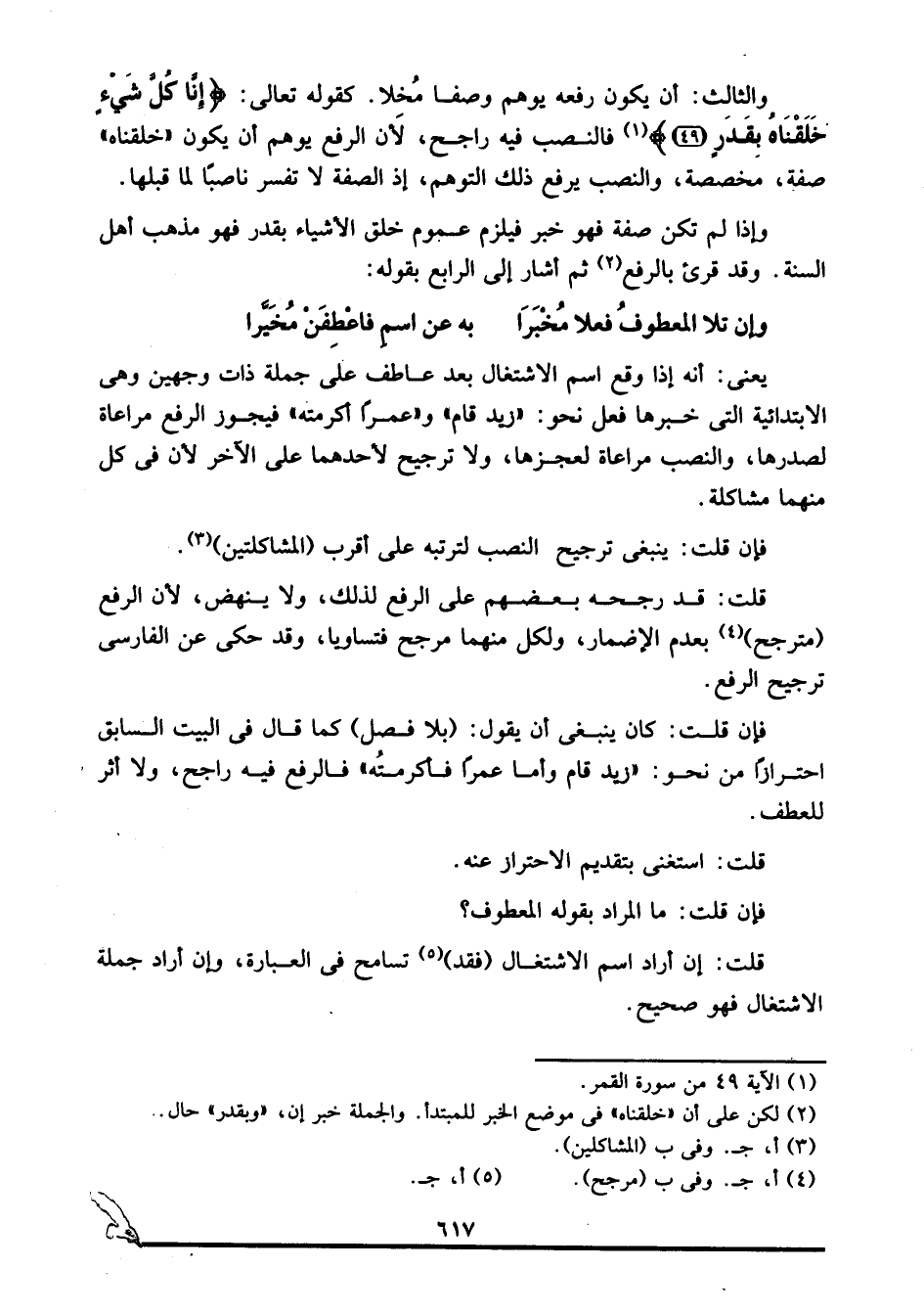 والثالث: أن يكون رفعه يوهم وصفا مُخلا, كقوله تعالى: {إِنَّا كُلَّ شَيْءٍ خَلَقْنَاهُ بِقَدَرٍ} 1, فالنصب فيه راجح؛ لأن الرفع يوهم أن يكون "خلقناه" صفة مخصصة، والنصب يرفع ذلك التوهم، إذ الصفة لا تفسر ناصبا لما قبلها.