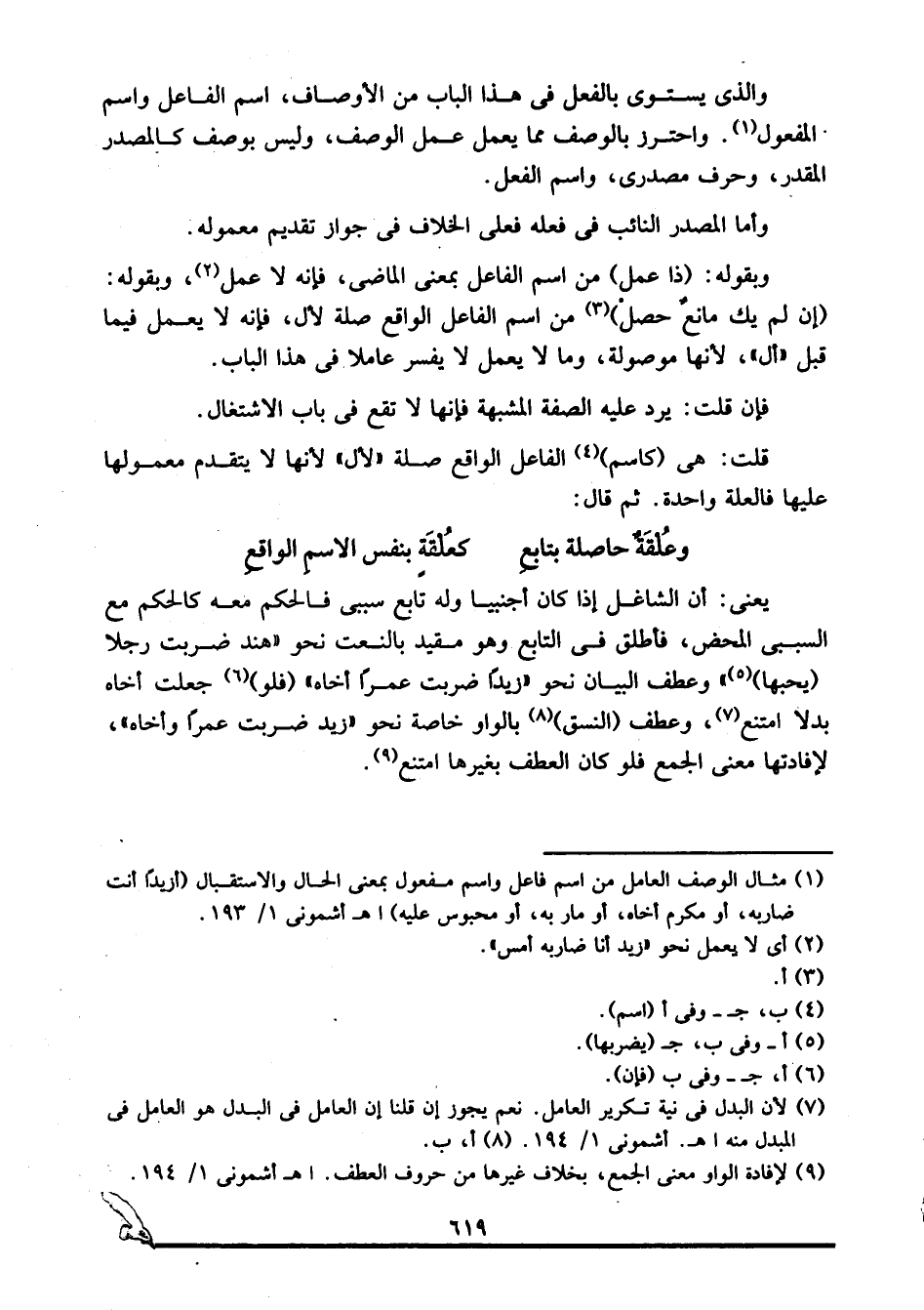1 مثال الوصف العامل من اسم فاعل واسم مفعول بمعنى الحال والاستقبال: "أزيدا أنت ضاربه, أو مكرم أخاه، أو مارّ به، أو محبوس عليه" ا. هـ. أشموني 1/ 193.