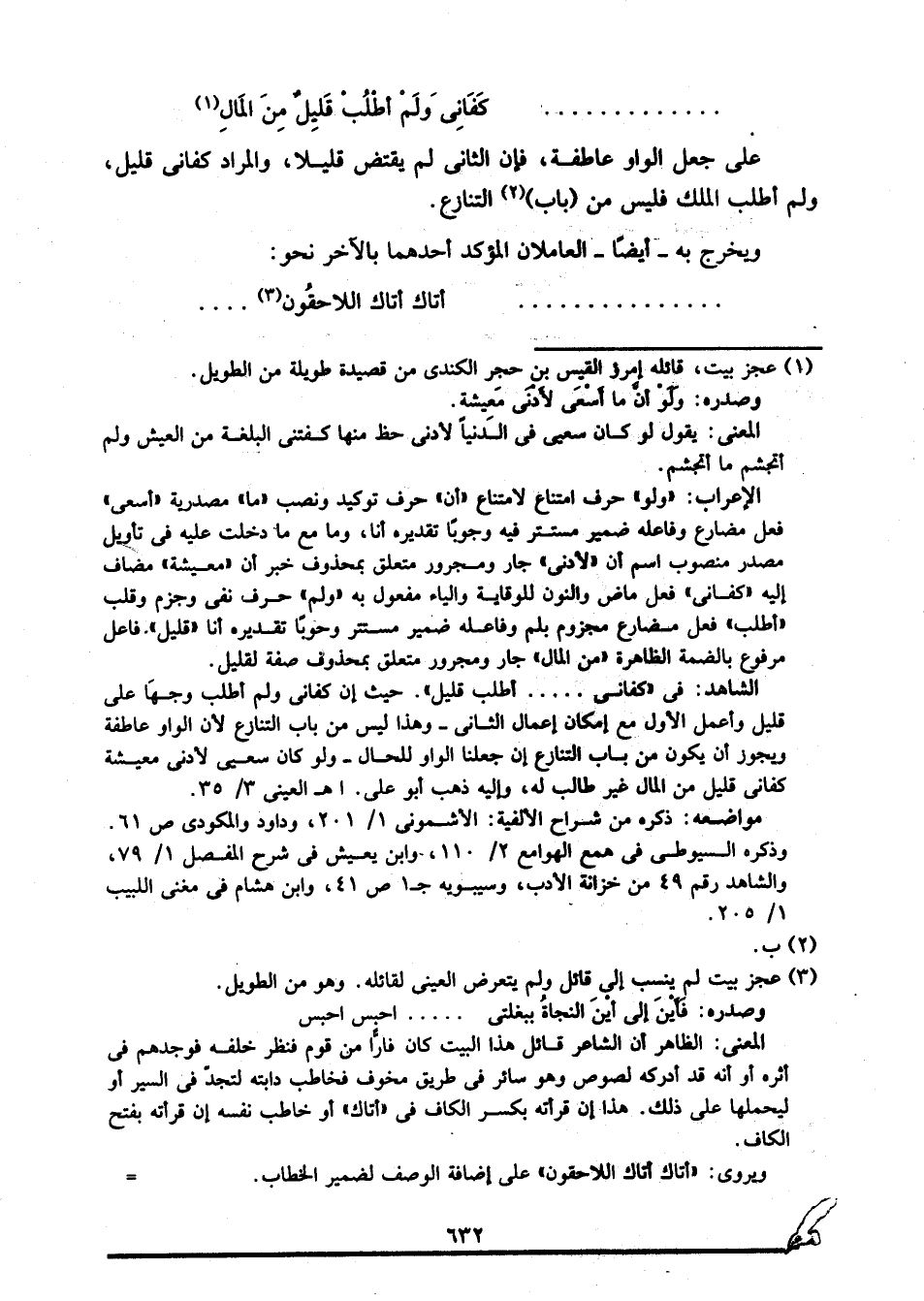 الشاهد: في "كفاني........ أطلب قليل"؛ حيث إن كفاني ولم أطلب وجها على قليل وأعمل الأول مع إمكان إعمال الثاني. وهذا ليس من باب التنازع؛ لأن الواو عاطفة, ويجوز أن يكون من باب التنازع إن جعلنا الواو للحال, ولو كان سعيي لأدنى معيشة كفاني قليل من المال غير طالب له، وإليه ذهب أبو علي. ا. هـ العيني 3/ 35.