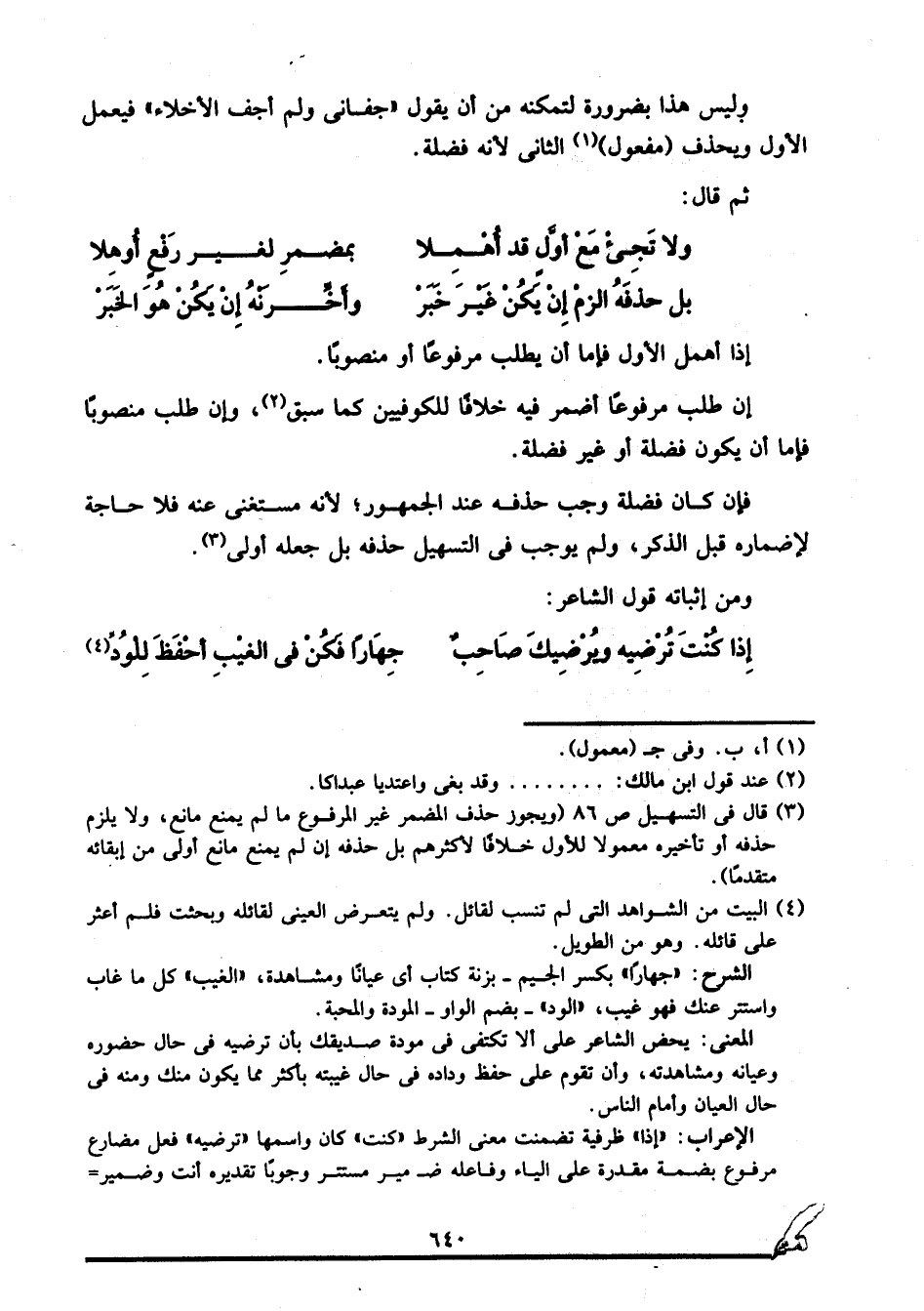 وليس هذا بضرورة؛ لتمكنه من أن يقول: "جفاني ولم أجف الأخلاء" فيعمل الأول ويحذف "مفعول"1 الثاني لأنه فضلة.