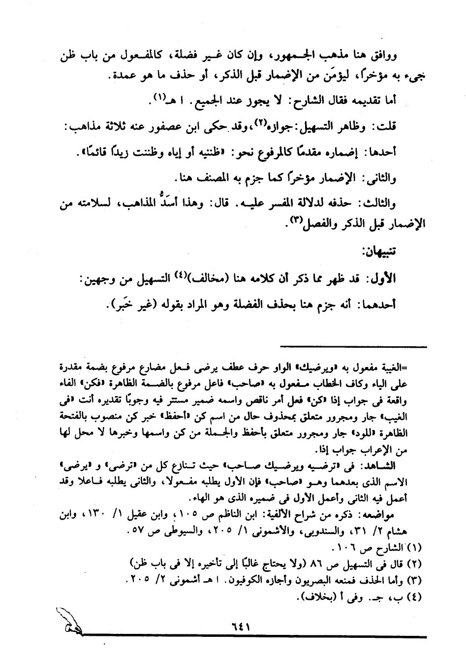 الأول: قد ظهر مما ذكر أن كلامه هنا "مخالف"4 التسهيل من وجهين: