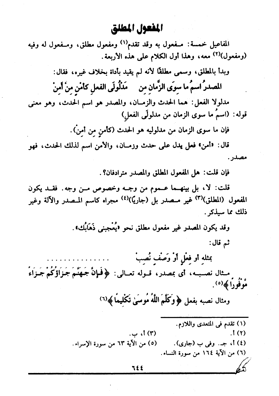 مثال نصبه، أي: بمصدر، قوله تعالى: {فَإِنَّ جَهَنَّمَ جَزَاؤُكُمْ جَزَاءً مَوْفُورًا} 5.