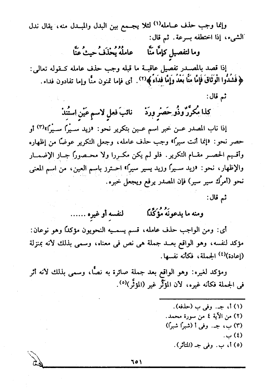 إذا قصد بالمصدر تفصيل عاقبة ما قبله, وجب حذف عامله كقوله تعالى: {فَشُدُّوا الْوَثَاقَ فَإِمَّا مَنًّا بَعْدُ وَإِمَّا فِدَاءً} 2 أي: فإما تمنون منا, وإما تفادون فداء.