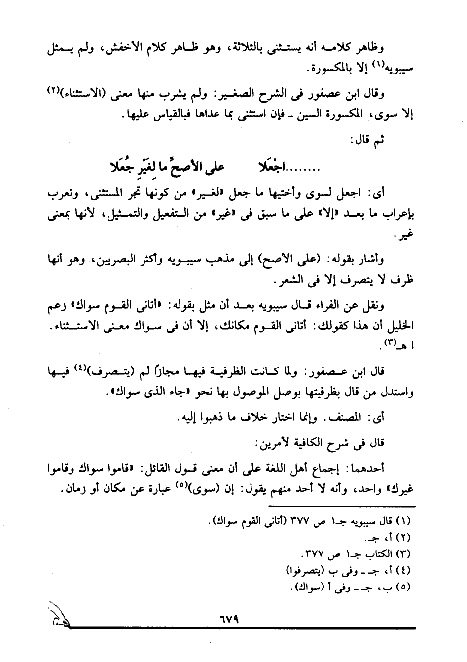 ونقل عن الفراء: قال سيبويه بعد أن مثّل بقوله: "أتاني القوم سواك": زعم الخليل أن هذا كقولك: أتاني القوم مكانك، إلا أن في سواك معنى الاستثناء. ا. هـ3.