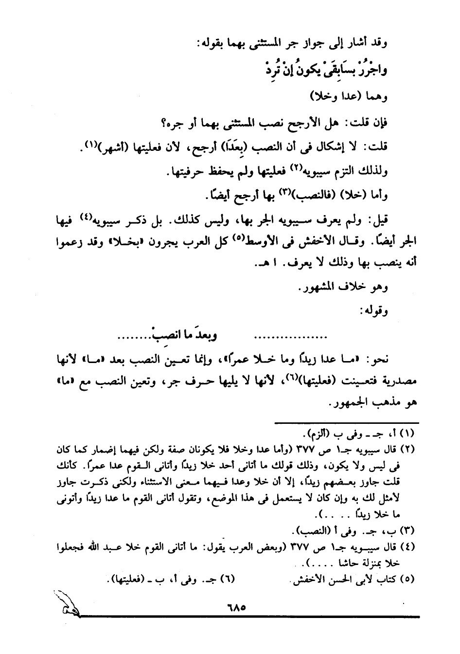 2 قال سيبويه جـ1 ص377: "وأما عدا وخلا فلا يكونان صفة ولكن فيهما إضمار كما كان في ليس ولا يكون، وذلك قولك: ما أتاني أحد خلا زيدا وأتاني القوم عدا عمرا, كأنك قلت: جاوز بعضهم زيدا، إلا أن خلا وعدا فيهما معنى الاستثناء, ولكني ذكرت جاوز لأمثل لك به وإن كان لا يستعمل في هذا الموضع، وتقول: أتاني القوم ما عدا زيدا, وأتوني ما خلا زيدا....".