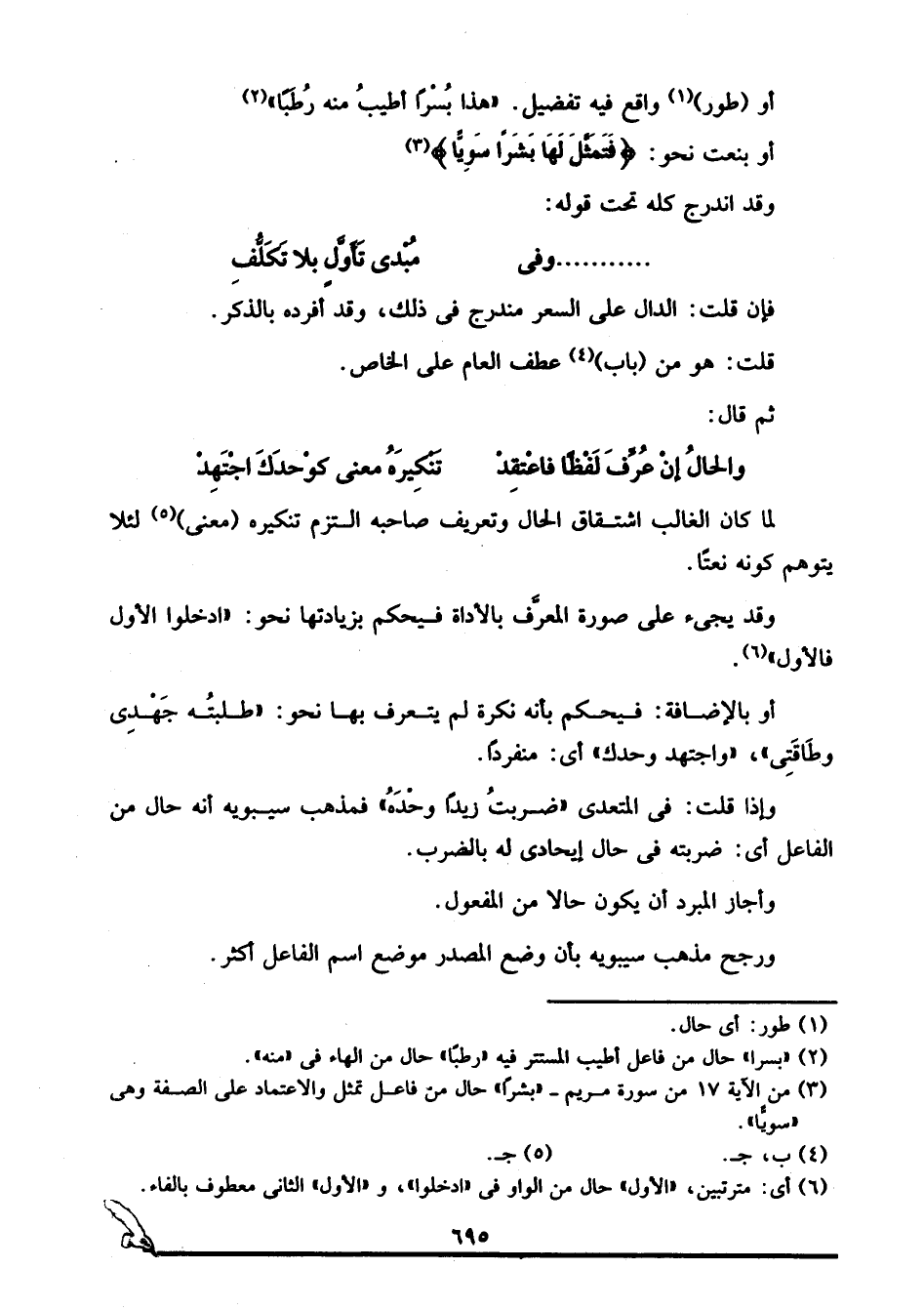 لما كان الغالب اشتقاق الحال وتعريف صاحبه, التزم تنكيره "معنى"5 لئلا يتوهم كونه نعتا.