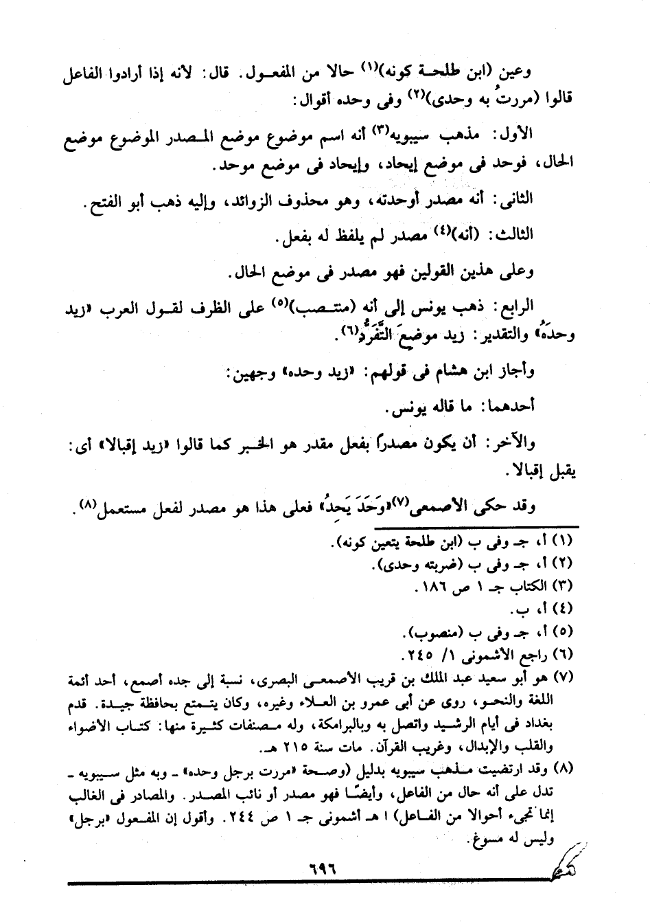 8 وقد ارتضيتُ مذهب سيبويه بدليل: "وصحة: "مررت برجل وحده" -وبه مثل سيبويه- تدل على أنه حال من الفاعل، وأيضا فهو مصدر أو نائب المصدر. والمصادر في الغالب إنما تجيء أحوالا من الفاعل" ا. هـ. أشموني جـ1 ص244. وأقول: إن المفعول "برجل" وليس له مسوغ.