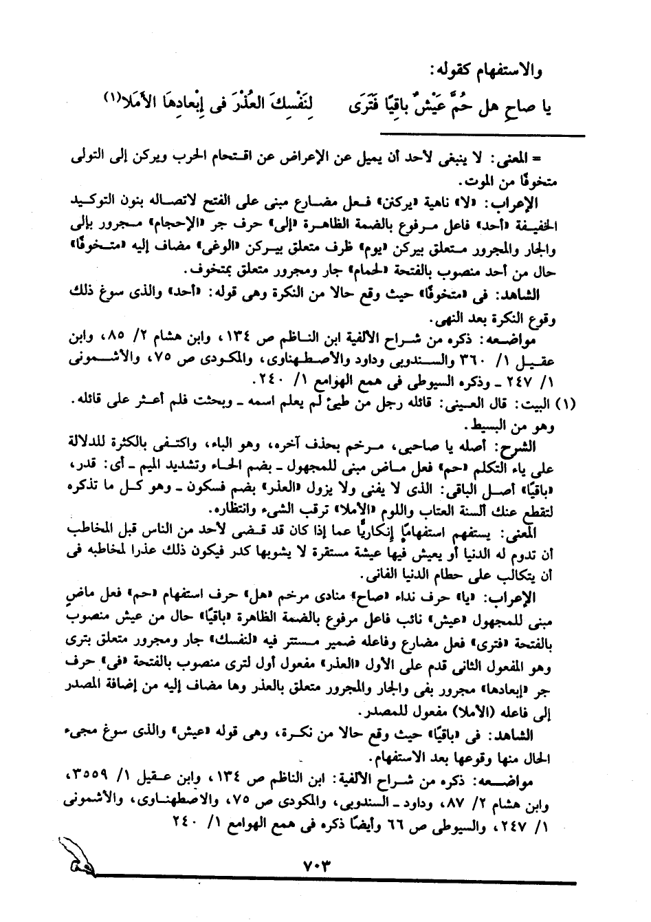 الإعراب: "يا" حرف نداء, "صاح" منادى مرخم, "هل" حرف استفهام, "حم" فعل ماض مبني للمجهول, "عيش" نائب فاعل مرفوع بالضمة الظاهرة, "باقيا" حال من العيش منصوب بالفتحة, "فترى" فعل مضارع وفاعله ضمير مستتر فيه, "لنفسك" جار ومجرور متعلق بترى وهو المفعول الثاني قدم على الأول, "العذر" مفعول أول لترى منصوب بالفتحة, "في" حرف جر, "إبعادها" مجرور بفي والجار والمجرور متعلق بالعذر وها مضاف إليه من إضافة المصدر إلى فاعله, "الأملا" مفعول للمصدر.