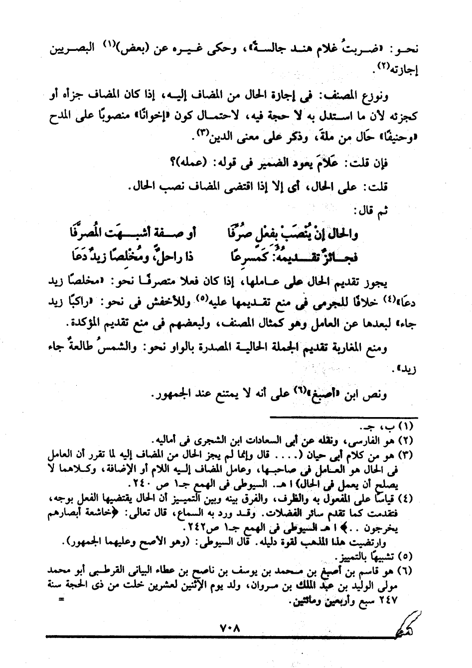 3 هو من كلام أبي حيان: " ... قال: وإنما لم يجُز الحال من المضاف إليه لما تقرر أن العامل في الحال هو العامل في صاحبها، وعامل المضاف إليه اللام أو الإضافة، وكلاهما لا يصلح أن يعمل في الحال" ا. هـ. السيوطي في الهمع جـ1 ص240.