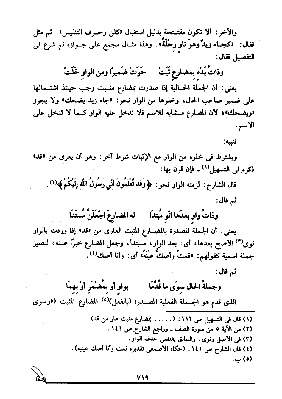 يعني: أن الجملة المصدرة بالمضارع المثبت العاري من "قد" إذا وردت بالواو نوى3 الأصح بعدها، أي: بعد الواو، مبتدأ، وجعل المضارع خبرا عنه؛ لتصير جملة اسمية كقولهم: "قمتُ وأصكُّ عينَهُ" أي: وأنا أصك4.