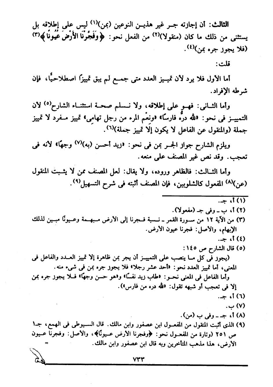 9 الذي أثبت المنقول من المفعول ابن عصفور وابن مالك. قال السيوطي في الهمع، جـ1 ص251: "وتارة من المفعول نحو: {وَفَجَّرْنَا الْأَرْضَ عُيُونًا} ، والأصل: وفجرنا عيون الأرض، هذا مذهب المتأخرين, وبه قال ابن عصفور وابن مالك.