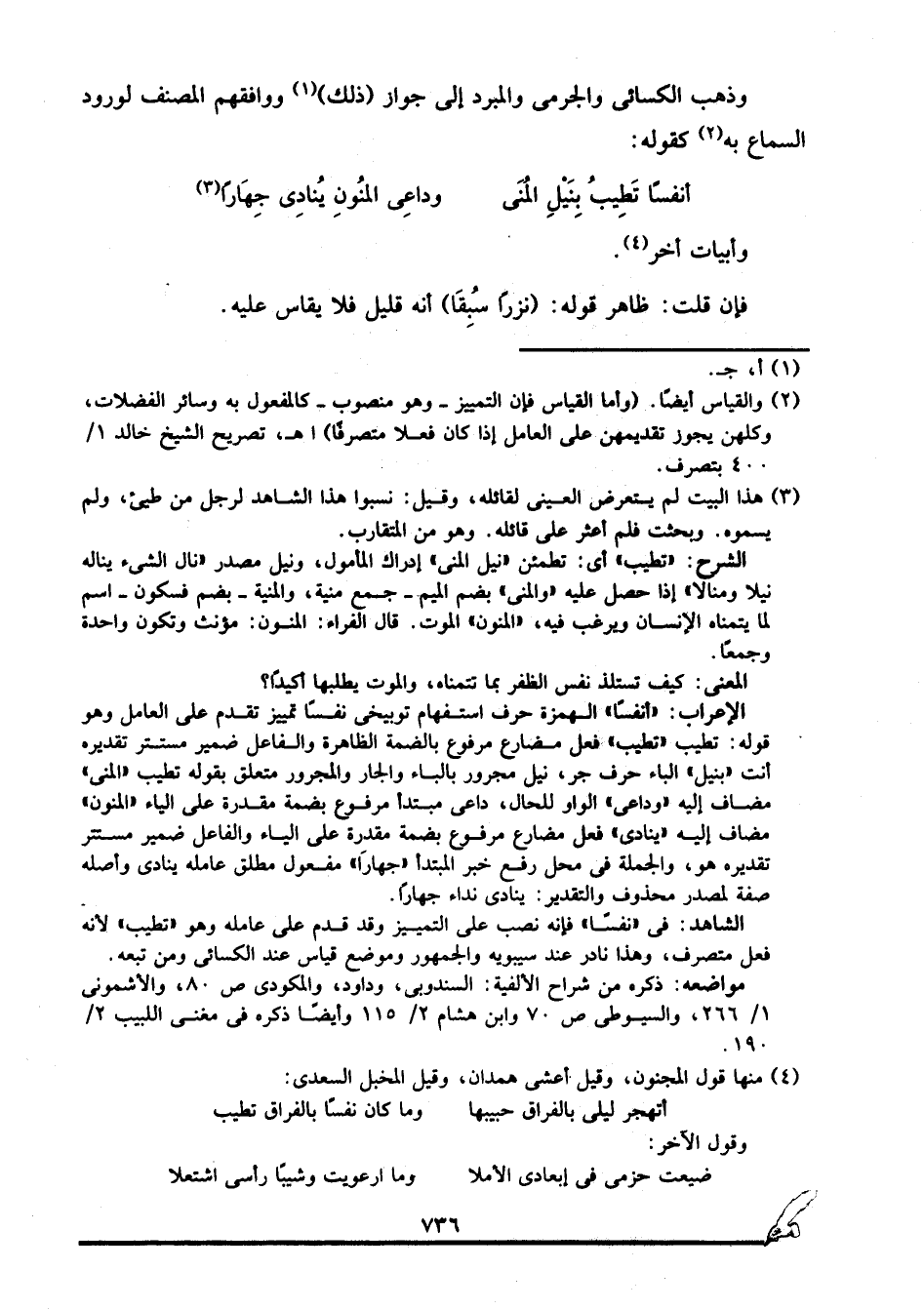 الإعراب: "أنفسا" الهمزة حرف استفهام توبيخي, نفسا تمييز تقدم على العامل وهو قوله: تطيب, "تطيب" فعل مضارع مرفوع بالضمة الظاهرة والفاعل ضمير مستتر تقديره أنت, "بنيل" الباء حرف جر، نيل مجرور بالباء والجار والمجرور متعلق بقوله: تطيب, "المنى" مضاف إليه, "وداعي" الواو للحال، داعي مبتدأ مرفوع بضمة مقدرة على الياء, "المنون" مضاف إليه, "ينادي" فعل مضارع مرفوع بضمة مقدرة على الياء والفاعل ضمير مستتر تقديره هو، والجملة في محل رفع خبر المبتدأ, "جهارا" مفعول مطلق عامله ينادي وأصله صفة لمصدر محذوف والتقدير: ينادي نداء جهارا.