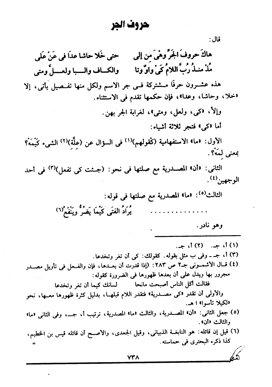 هذه عشرون حرفا مشتركة في جر الاسم ولكل منها تفصيل يأتي، إلا "خلا، وحاشا، وعدا" فإن حكمها تقدم في الاستثناء.