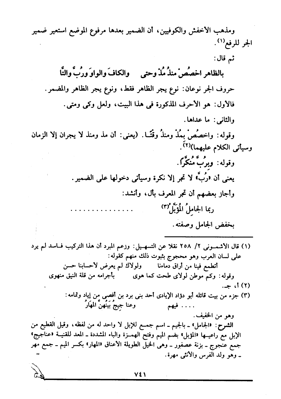 الشرح: "الجامل" -بالجيم- اسم جمع للإبل لا واحد له من لفظه، وقيل: القطيع من الإبل مع راعيها, "المؤبل" -بضم الميم وفتح الهمزة والباء المشددة- المعد للقنية, "عناجيج" جمع عنجوج -بزنة عصفور- وهي الخيل الطويلة الأعناق, "المهار" -بكسر الميم- جمع مهر وهو ولد الفرس, والأنثى مهرة. =