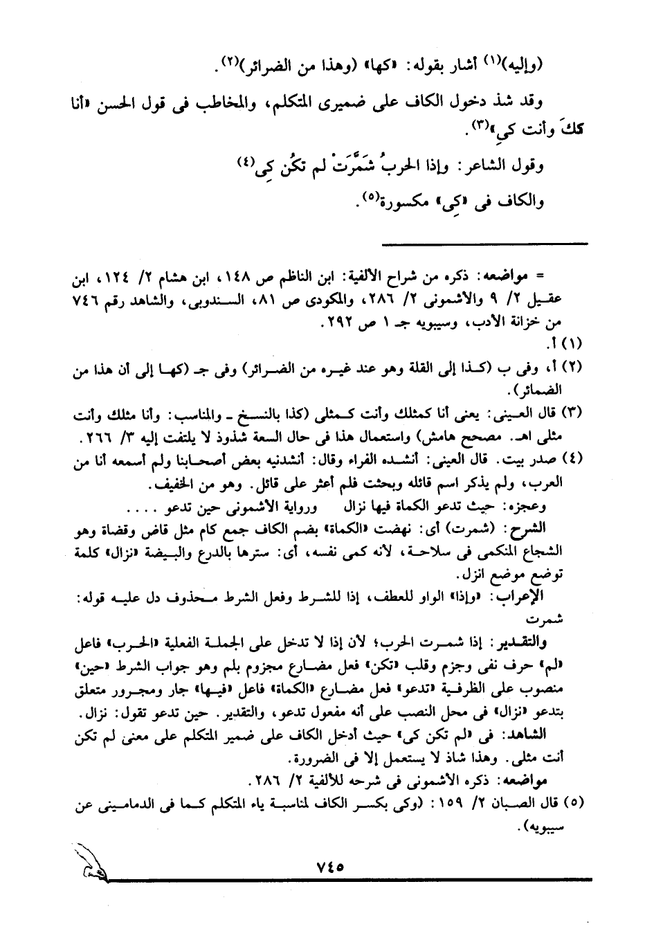 5 قال الصبان 2/ 159: "وكي -بكسر الكاف- لمناسبة ياء المتكلم كما في الدماميني عن سيبويه".