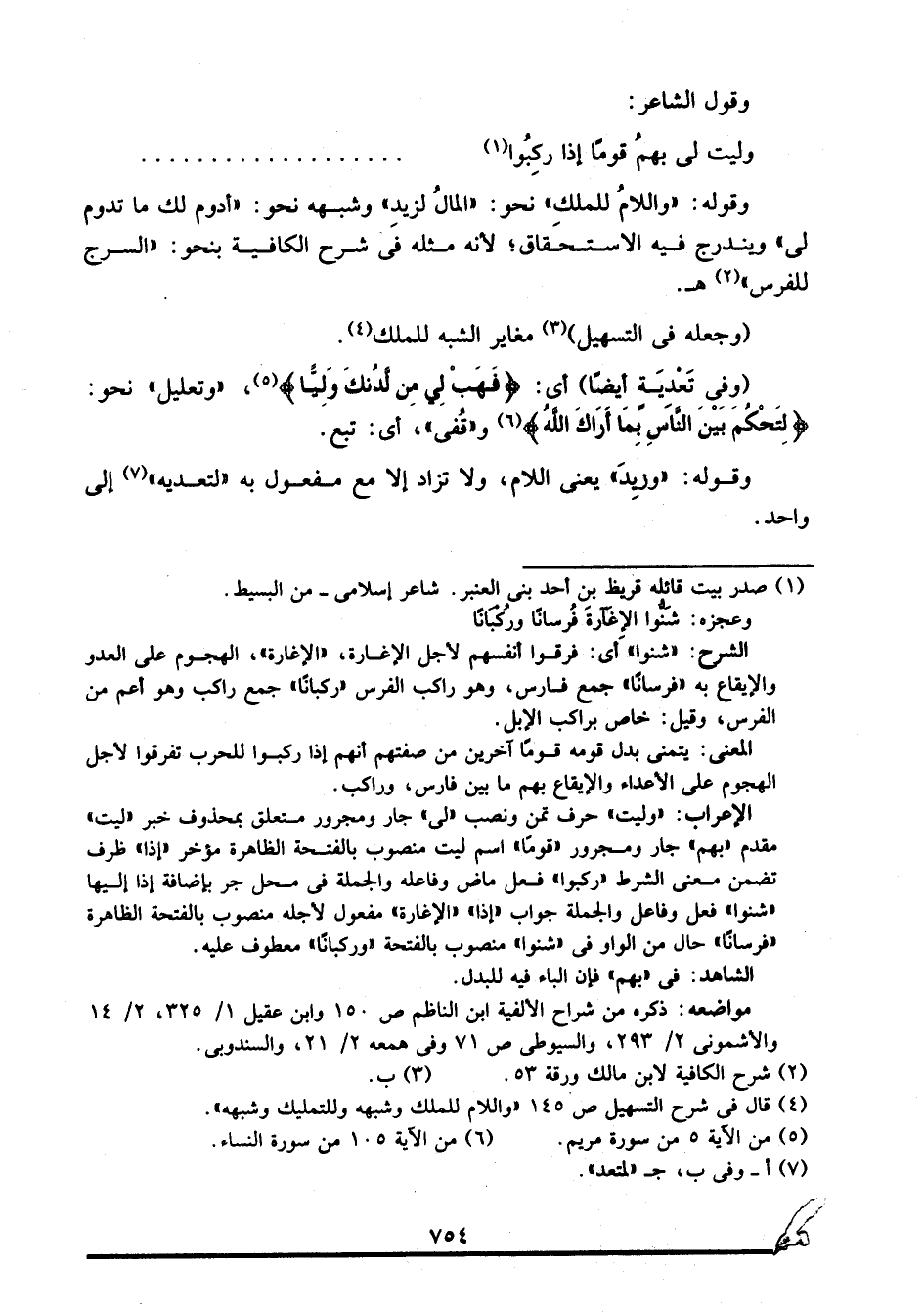 الإعراب: "وليت" حرف تمنٍّ ونصب, "لي" جار ومجرور متعلق بمحذوف خبر "ليت" مقدم, "بهم" جار ومجرور, "قوما" اسم ليت منصوب بالفتحة الظاهرة مؤخر, "إذا" ظرف تضمن معنى الشرط, "ركبوا" فعل ماض وفاعله والجملة في محل جر بإضافة إذا إليها, "شنوا" فعل وفاعل والجملة جواب "إذا", "الإغارة" مفعول لأجله منصوب بالفتحة الظاهرة, "فرسانا" حال من الواو في "شنوا" منصوب بالفتحة, "وركبانا" معطوف عليه.