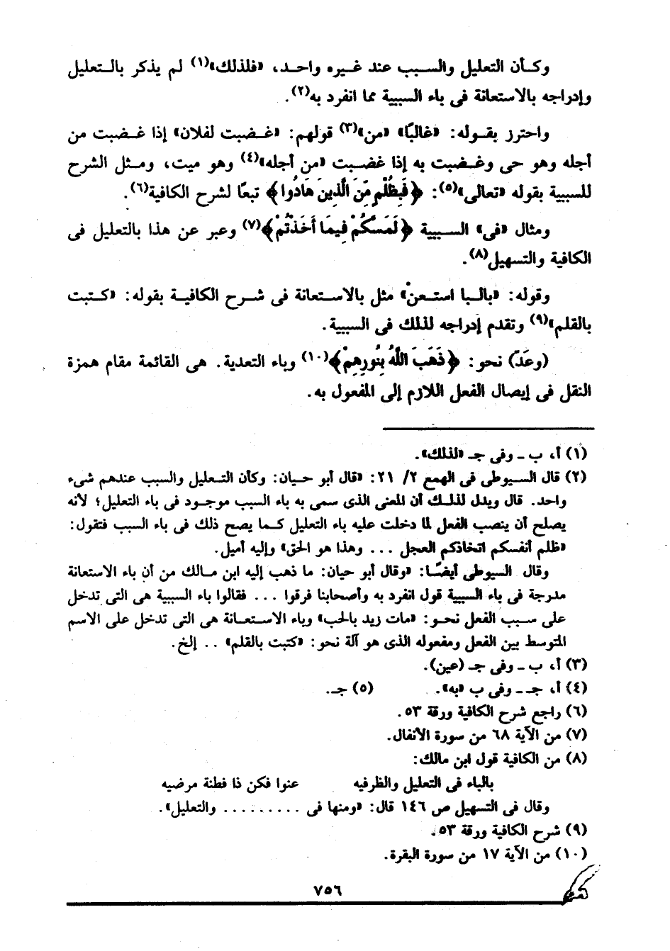 واحترز بقوله: "غالبا" "من"3 قولهم: "غضبت لفلان" إذا غضبت من أجله وهو حي, وغضبت به إذا غضبت "من أجله"4 وهو ميت، ومثّل الشرح للسببية بقوله "تعالى"5: {فَبِظُلْمٍ مِنَ الَّذِينَ هَادُوا} تبعا لشرح الكافية6.