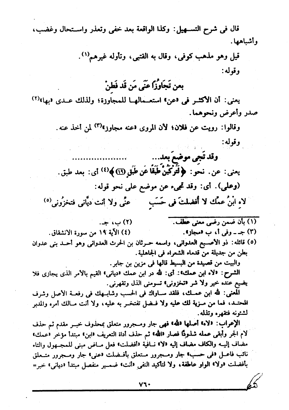 الإعراب: "لاه" أصلها "لله" فهي جار ومجرور متعلق بمحذوف خبر مقدم, ثم حذف لام الجر وأبقي عمله شذوذا فصار "الله" ثم حذف أداة التعريف, "ابن" مبتدأ مؤخر, "عمك" مضاف إليه والكاف مضاف إليه, "لا" نافية, "أفضلت" فعل ماض مبني للمجهول والتاء نائب فاعل, "في حسب" جار ومجرور متعلق بأفضلت, "عني" جار ومجرور متعلق بأفضلت, "ولا" الواو عاطفة، ولا لتأكيد النفي, "أنت" ضمير منفصل مبتدأ, "دياني" خبر =