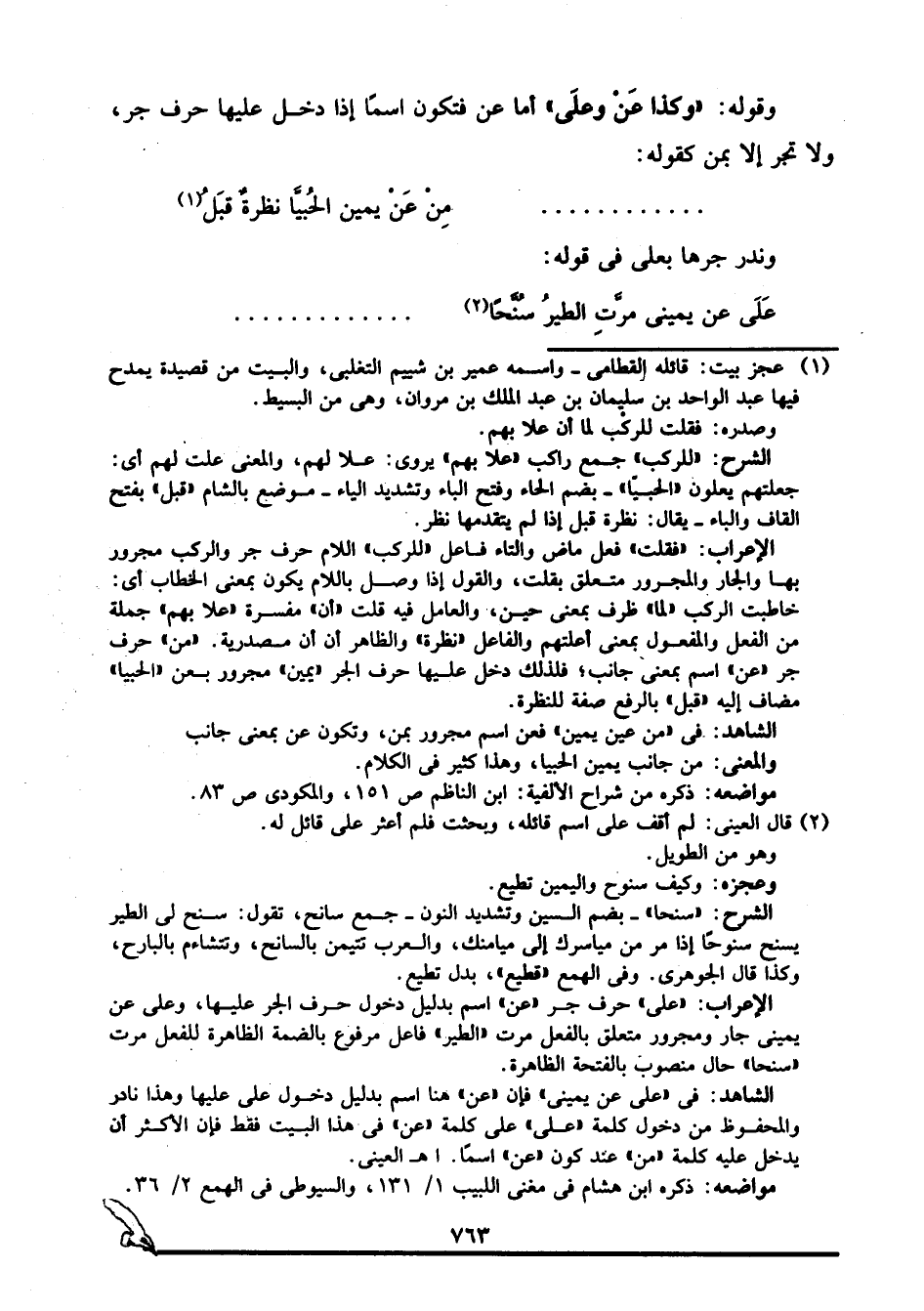 الشاهد: في "على عن يميني", فإن "عن" هنا اسم بدليل دخول على عليها, وهذا نادر والمحفوظ من دخول كلمة "على" على كلمة "عن" في هذا البيت فقط, فإن الأكثر أن يدخل عليه كلمة "من" عند كون "عن" اسما. ا. هـ العيني.