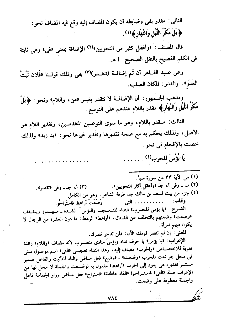 قال المصنف: "وأغفل كثير من النحويين"2 الإضافة بمعنى "في" وهي ثابتة في الكلم الفصيح بالنقل الصحيح. ا. هـ.