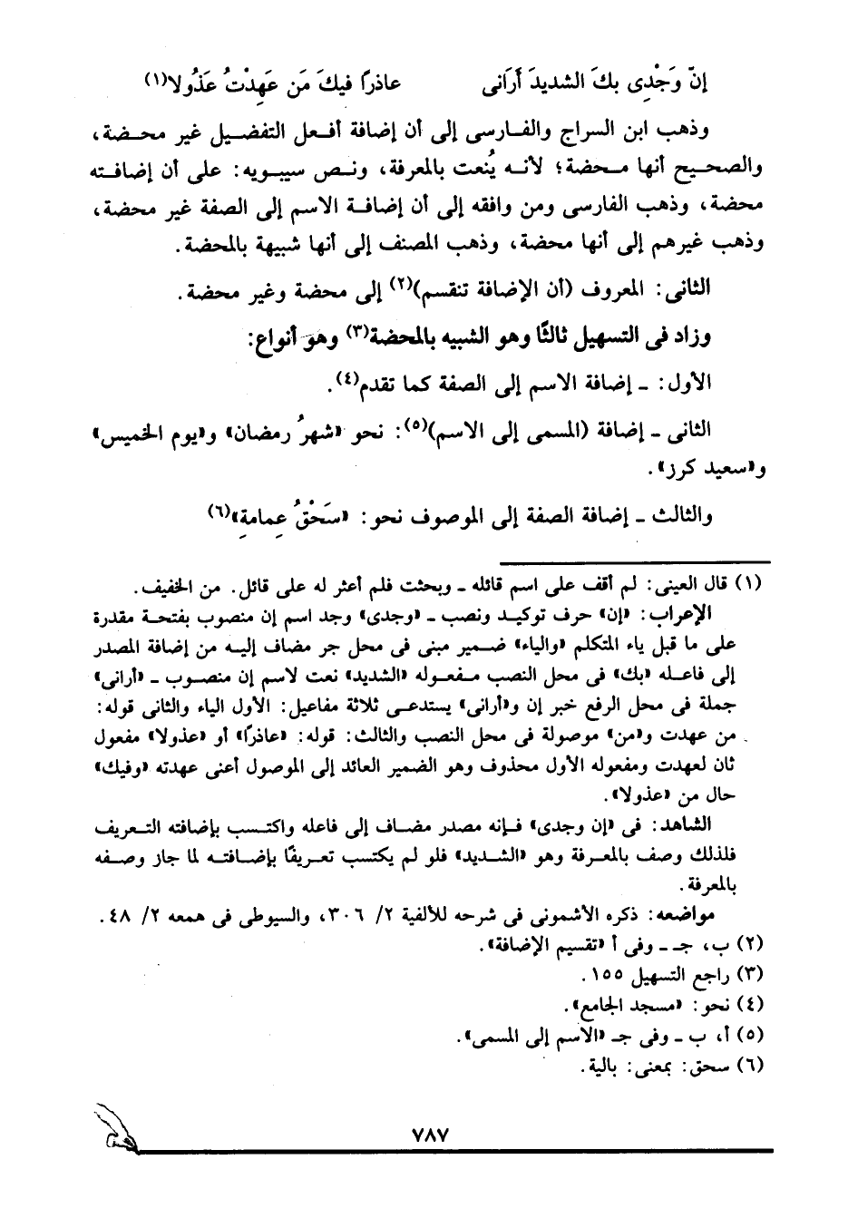 الشاهد: في "إن وجدي", فإنه مصدر مضاف إلى فاعله واكتسب بإضافته التعريف؛ فلذلك وصف بالمعرفة وهو "الشديد", فلو لم يكتسب تعريفا بإضافته لما جاز وصفه بالمعرفة.