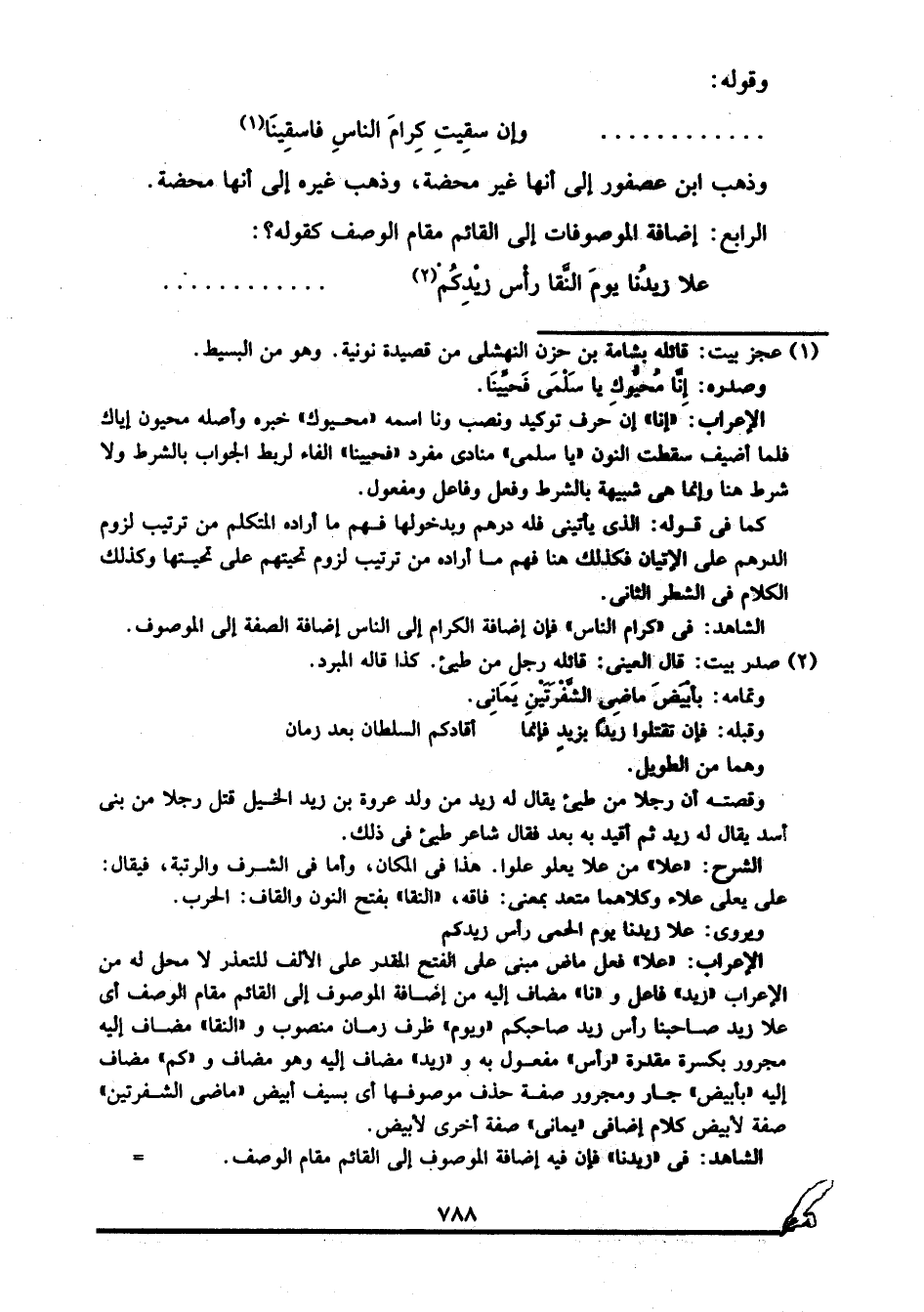 الإعراب: "علا" فعل ماض مبني على الفتح المقدر على الألف للتعذر لا محل له من الإعراب, "زيد" فاعل و"نا" مضاف إليه من إضافة الموصوف إلى القائم مقام الوصف, أي: علا زيد صاحبنا رأس زيد صاحبكم, "ويوم" ظرف زمان منصوب, و"النقا" مضاف إليه مجرور بكسرة مقدرة, "رأس" مفعول به, و"زيد" مضاف إليه وهو مضاف و"كم" مضاف إليه, "بأبيض" جار ومجرور صفة حذف موصوفها أي: بسيف أبيض, "ماضي الشفرتين" صفة لأبيض كلام إضافي, "يماني" صفة أخرى لأبيض.