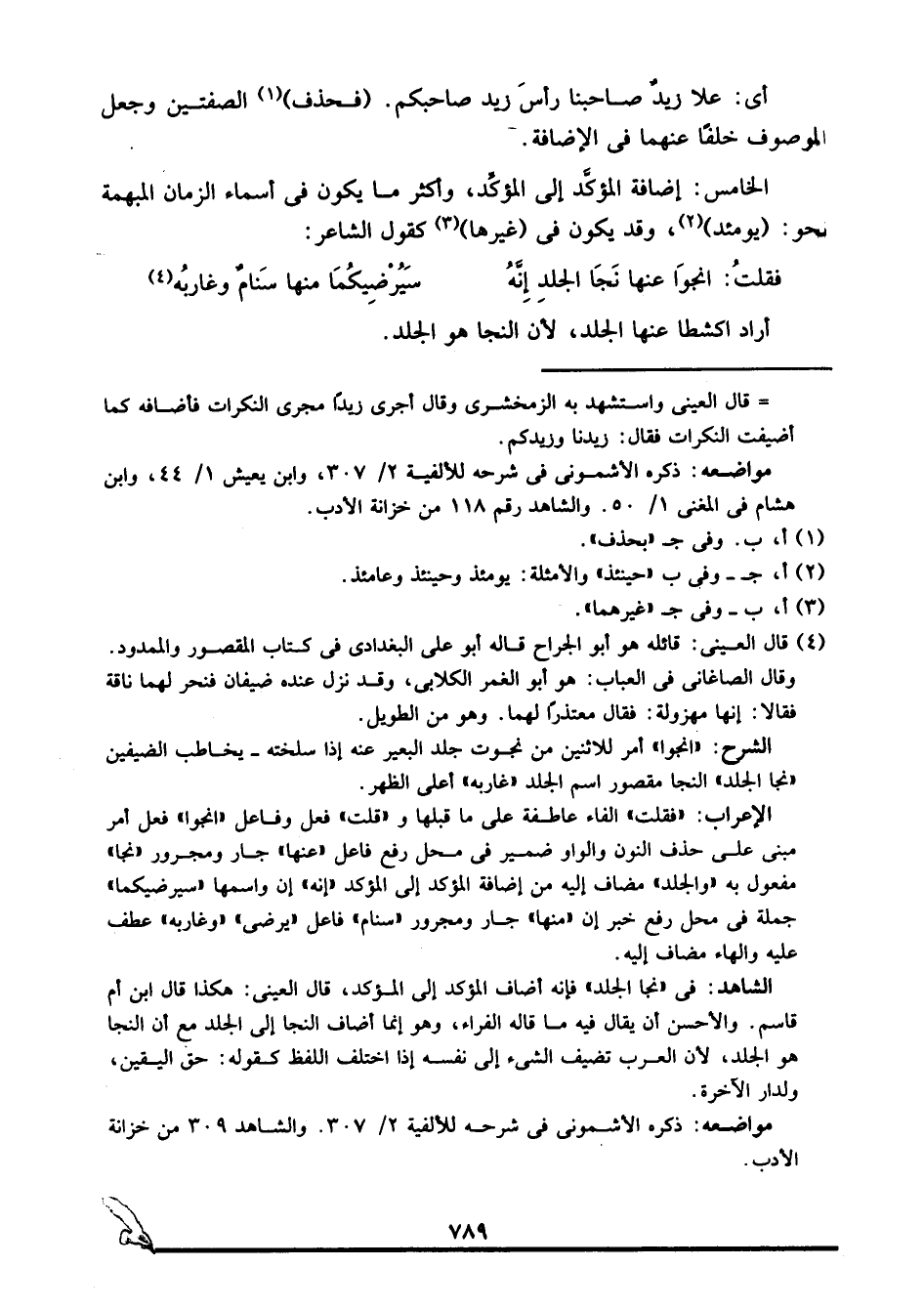 الشاهد: في "نجا الجلد", فإنه أضاف المؤكد إلى المؤكد، قال العيني: هكذا قال ابن أم قاسم. والأحسن أن يقال فيه ما قاله الفراء، وهو إنما أضاف النجا إلى الجلد مع أن النجا هو الجلد؛ لأن العرب تضيف الشيء إلى نفسه إذا اختلف اللفظ, كقوله: حق اليقين، ولدار الآخرة.